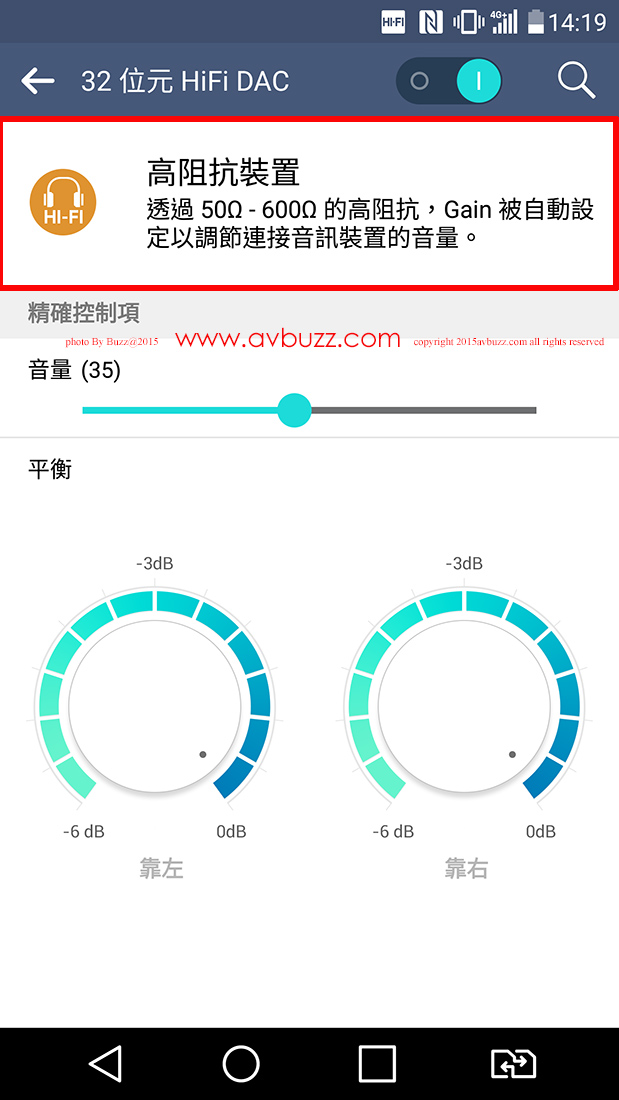 自動感應耳機阻抗 V10另一強項,就是能 自動感應 接入來的耳機是否屬於高阻抗,下圖所見是V10 操作介面,平日處於備用或接上一般耳機時,操作介面會以左圖所見狀態運作和顯示。 當用家接入 50Ω 或以上高阻抗耳機,她便能自動感應作出大輸出調節作配合,如右圖所見,接上AKG 612 Pro 後,V10 立即自動調校擴音器的增益輸出。 這功能不難在其他DAP 流動播放器 或耳擴找到的 high & low gain 切換,但手機就在 V10 找到了。
