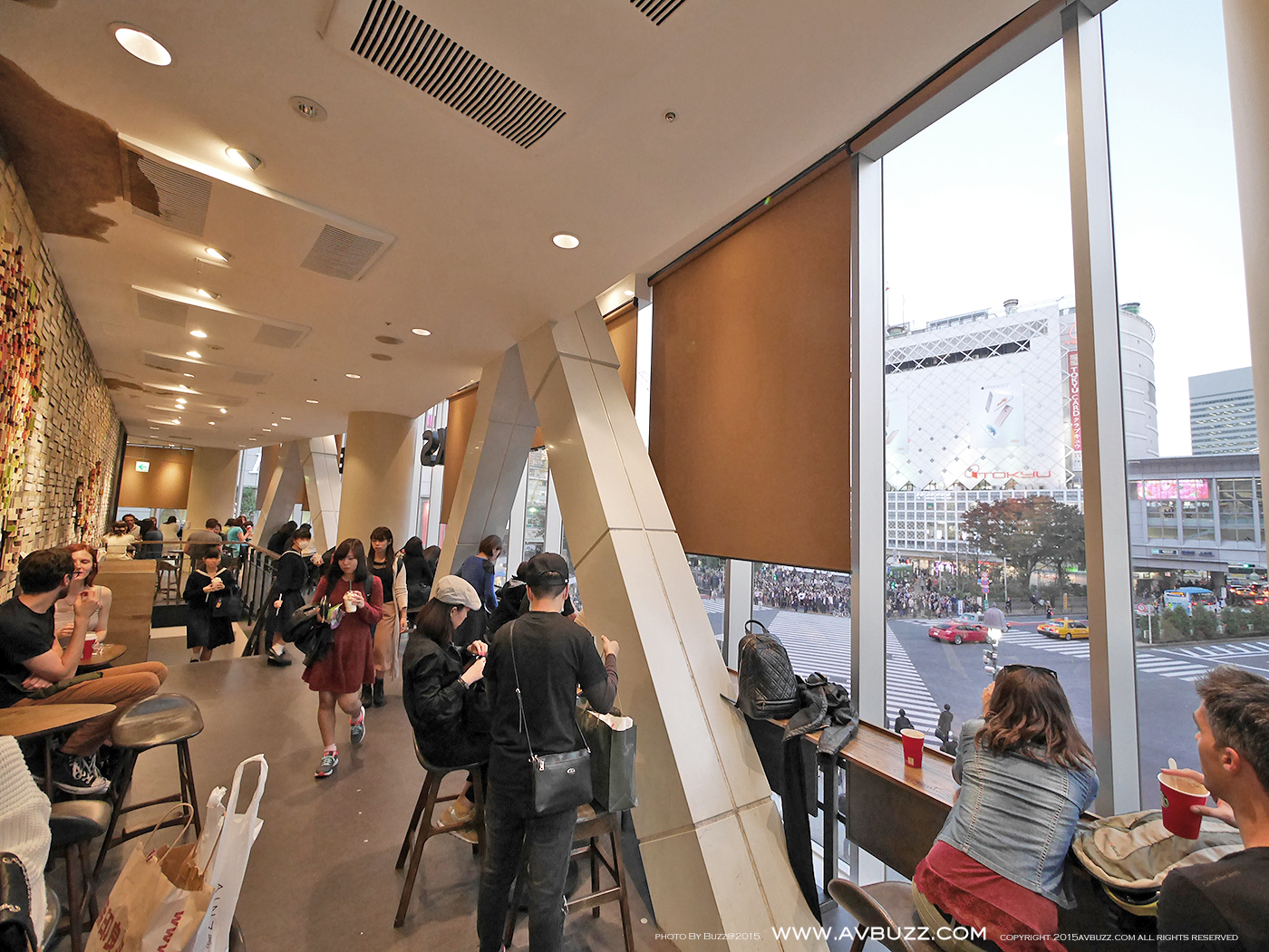 平常在付近行得累,一定先在地下光顧 Starbucks 的季節限定飲品,然後步上二樓看著十字路一大班人步過班馬線的街景,一邊品嘗,便是來這裡目的。 e-earphone 新分店,正正就是在圖中所見,一牆之隔天花之上,如果這個天花是透明的話,大家便可見到 e-earphone新分店了。係咪好方便呢?