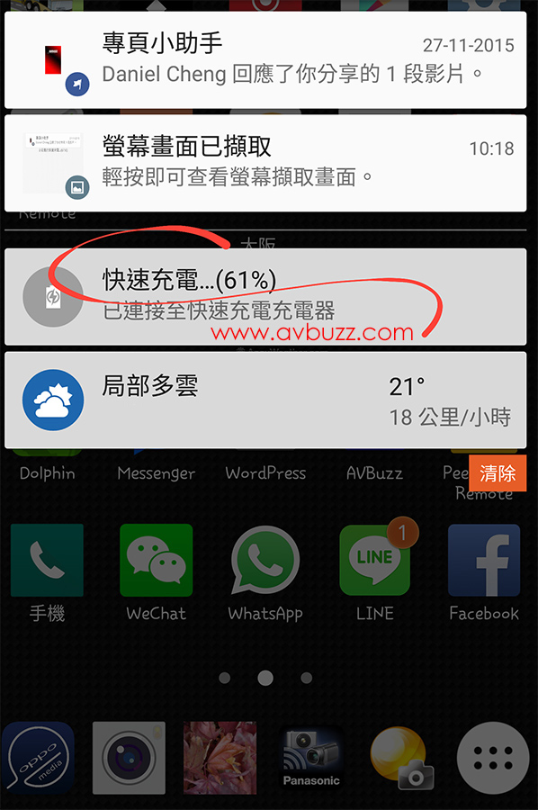 以 LG V10 手機為例 ,由於支援這技術,接上 Quick Charge 2.0 接口,在手機裡也有提示正在食快餐中。