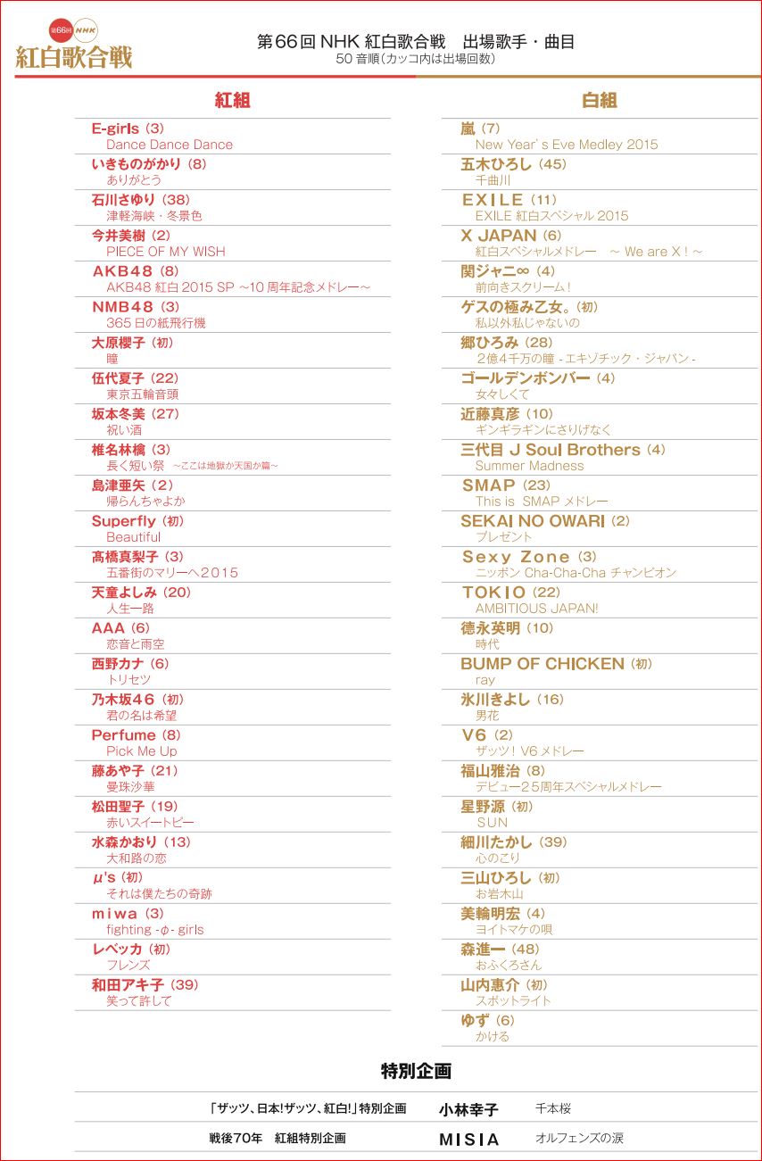 一年一度紅白歌唱大賽又來了~~~播出日期為日本當地時間 2015年12月31日 19:15pm ~ 23:45pm,於日本NHK 電視台直播,下圖為各出席歌手名單,還有他們主唱曲目,當中有你喜歡的歌手出席嗎?