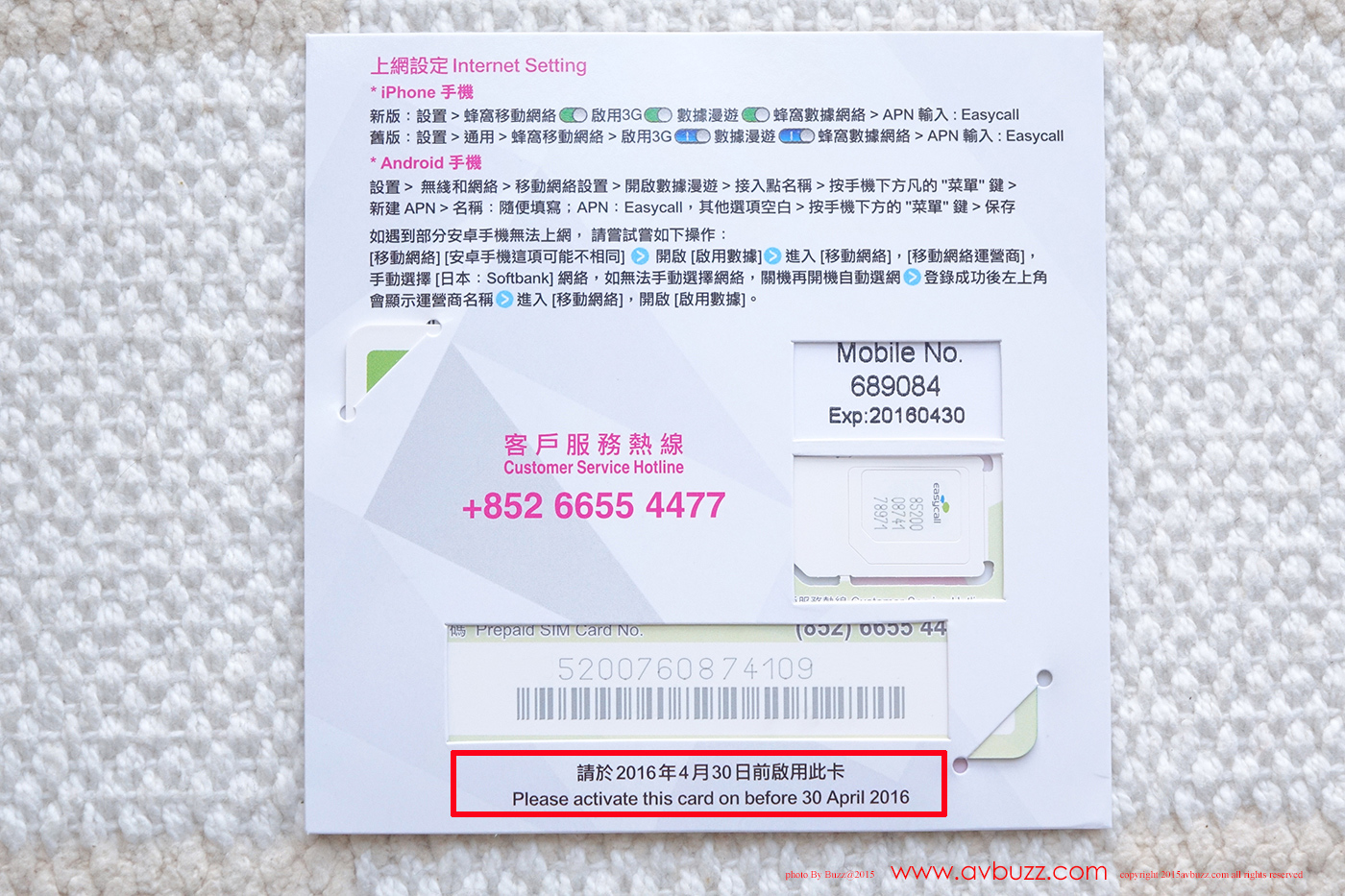 背面付有首次設定教學。購買前最最最重要當然係第一時間睇睇食用日期先,呢張 4月尾到期,咁無問題丫。否則去到日本先發覺過期就無仇報了。呢張卡還提供電話號碼撥打,由於我用唔著,正所謂事不關己,乜乜物物。