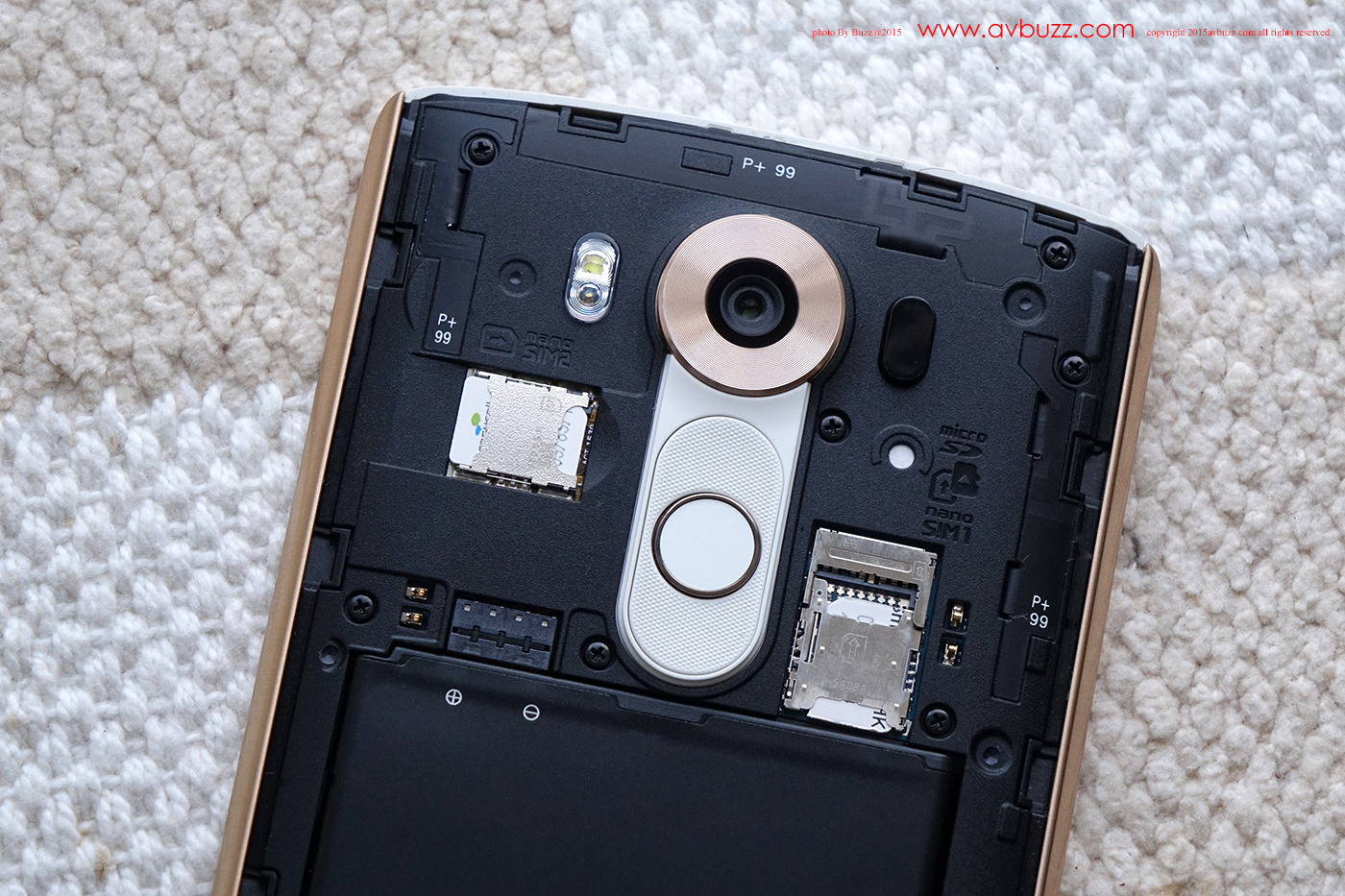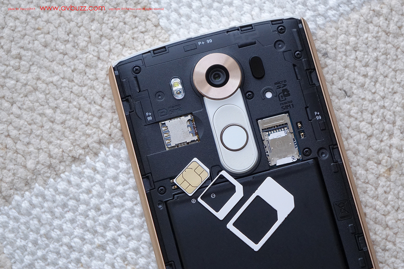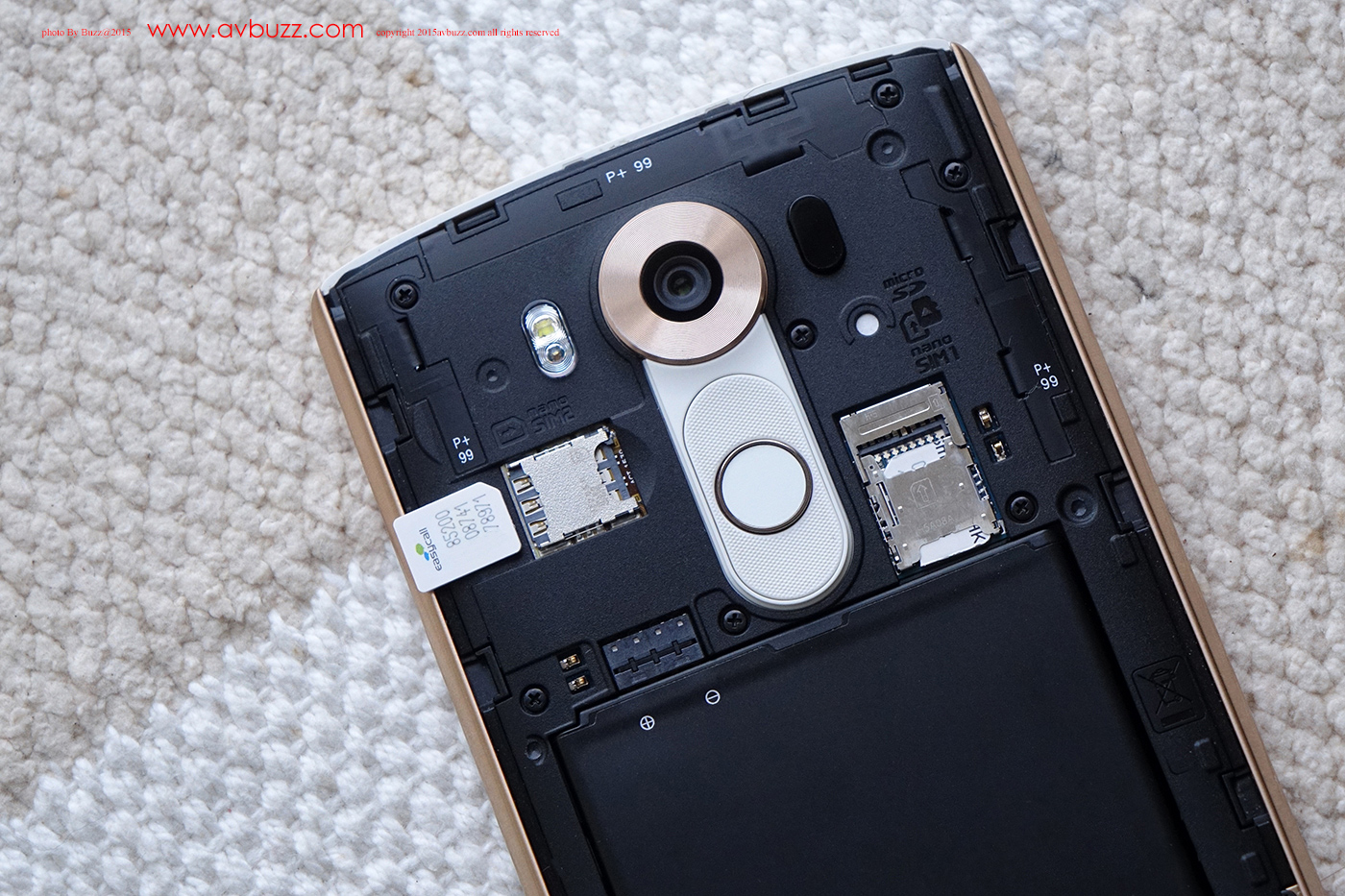 LG V10 屬於雙卡雙待 Nano SIM 款式,右手邊早插著香港每日使用的數碼通 Nano SIM ,圖中左上角卡槽,正等待這卡的插上,這張三合一SIM 卡,徒手便可把卡分離成適合LG V10 所用的 Nano SIM。