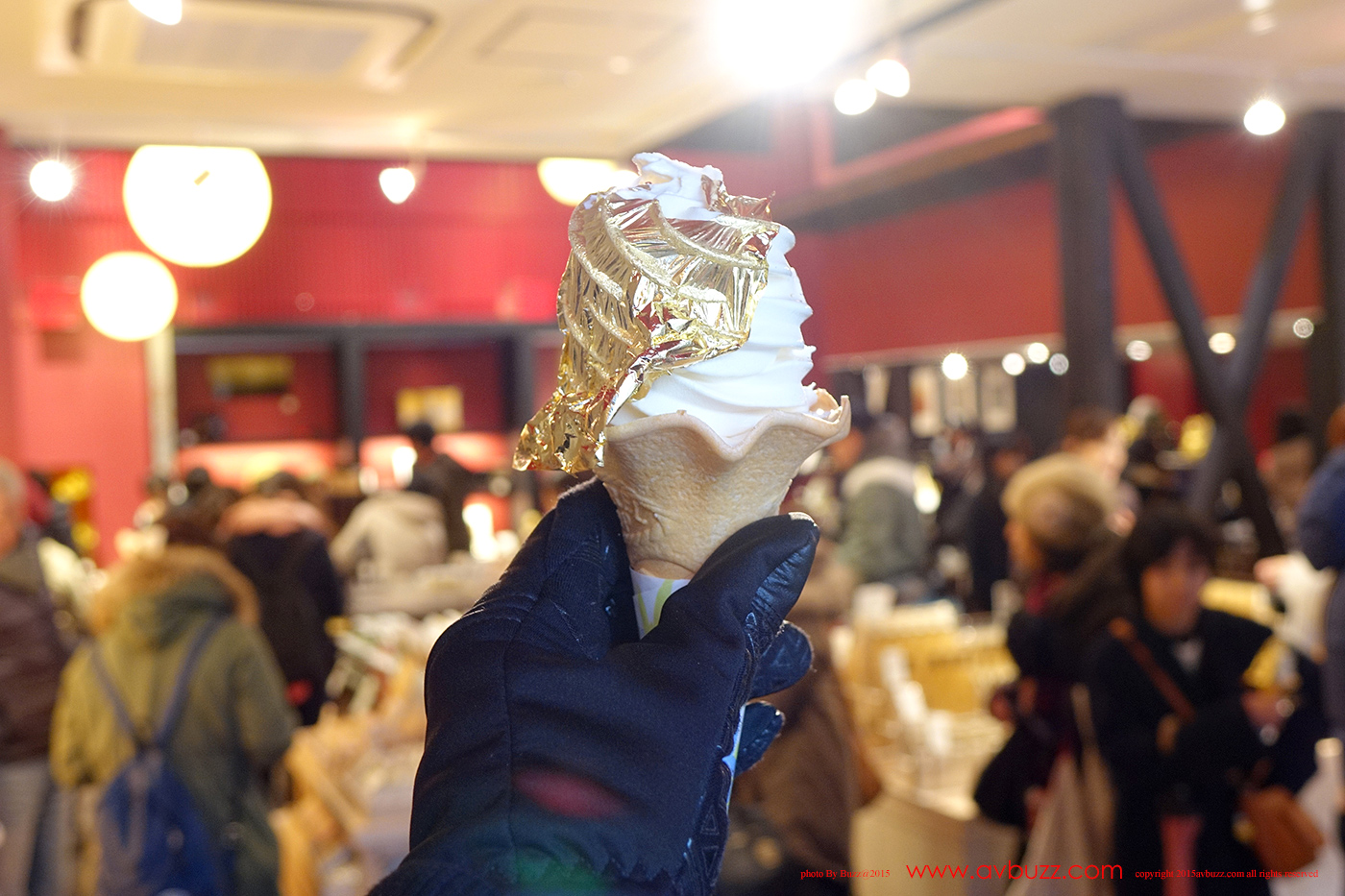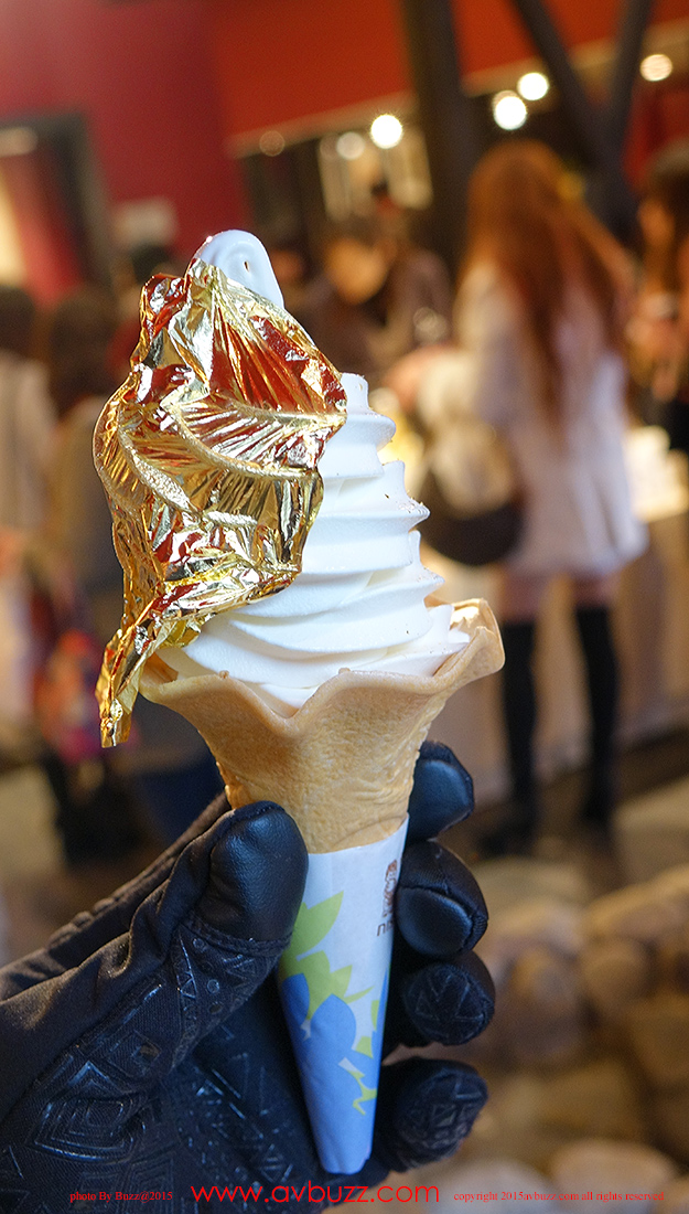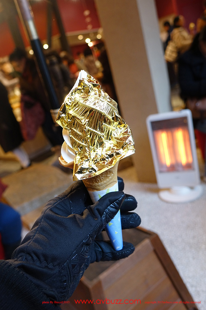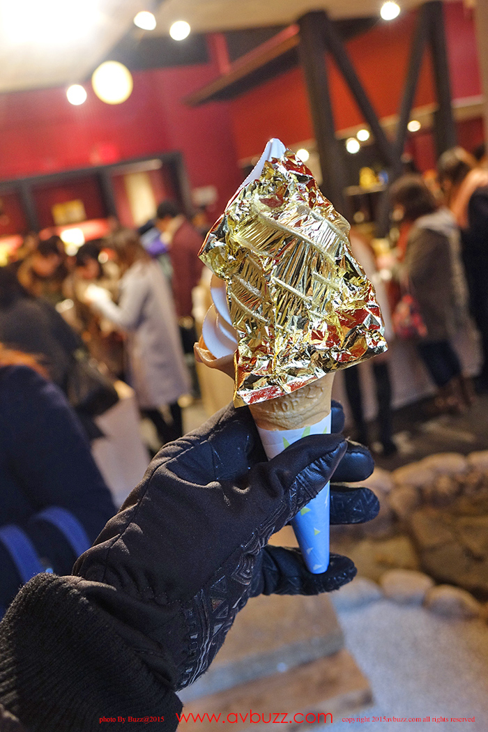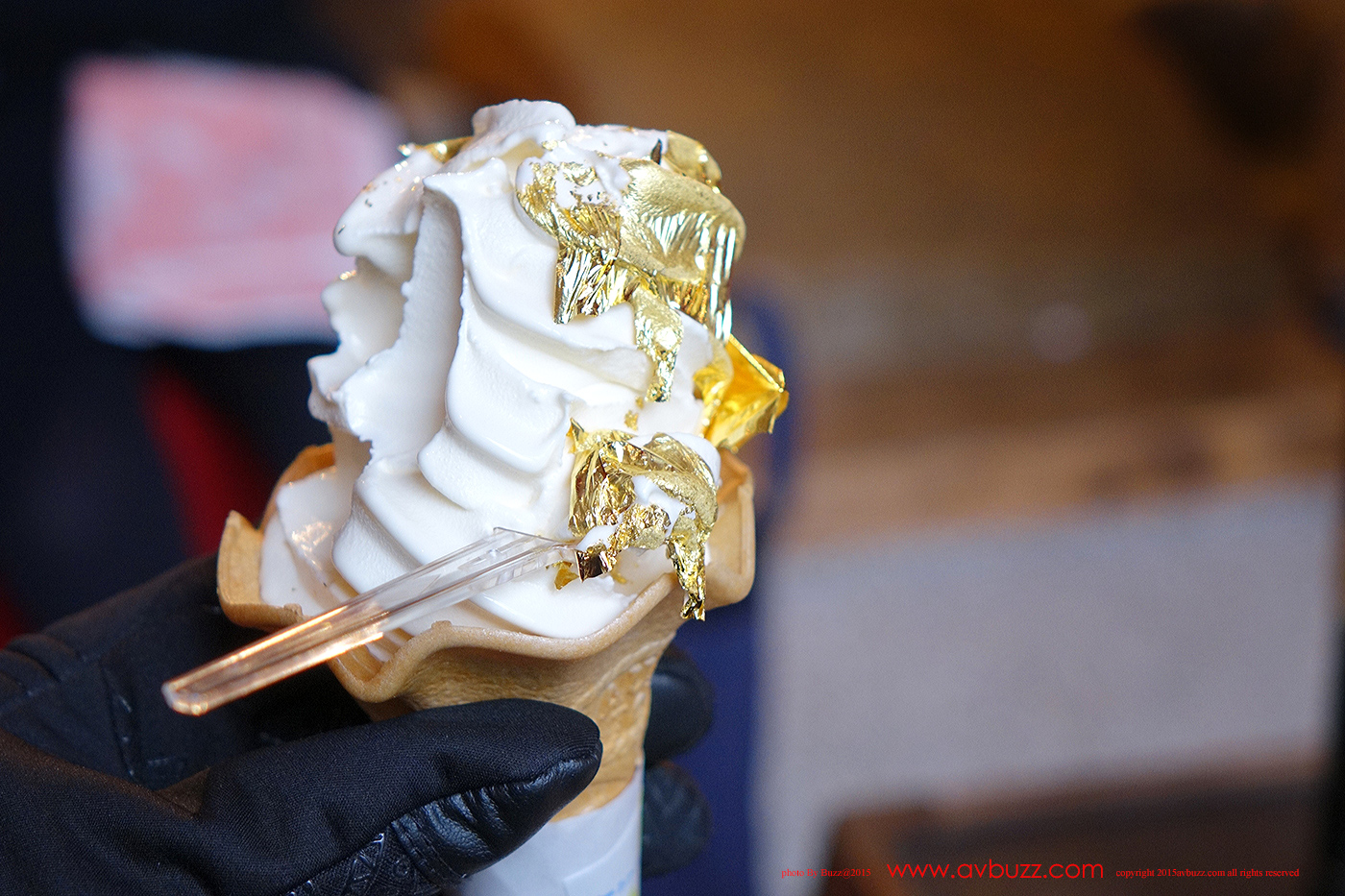 各位觀眾~~~~一生人必食一次的金澤金箔軟雪糕。一整片金箔放上軟雪糕,加上現場提供的光源和背景,好震撼啊。