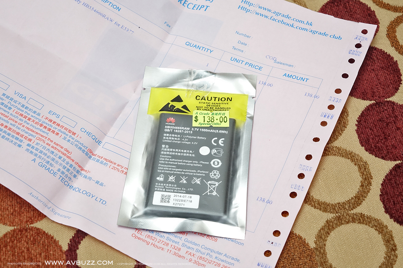 電池容量 1500mAh ,售貨員說大約可連續工作6小時,最長待機300 小時,由於朋友是遊客,每日早出晚歸是必然,只能提供連續 6小時運作,黃昏時候一定慘絕人寰,不想朋友多帶尿袋出街,於是向店員多買一塊後備電。售貨員說,他們沒有發售配件。一分鐘後………….,在 A Grade 配到,對 $700 港元一部華為 E5373s 來講,一塊電索價 $138,真係好貴呢,不過為了朋友,包起佢丫唔該,包裝背面有雷射防偽標籤,其實 A Grade 都夠照啦。
