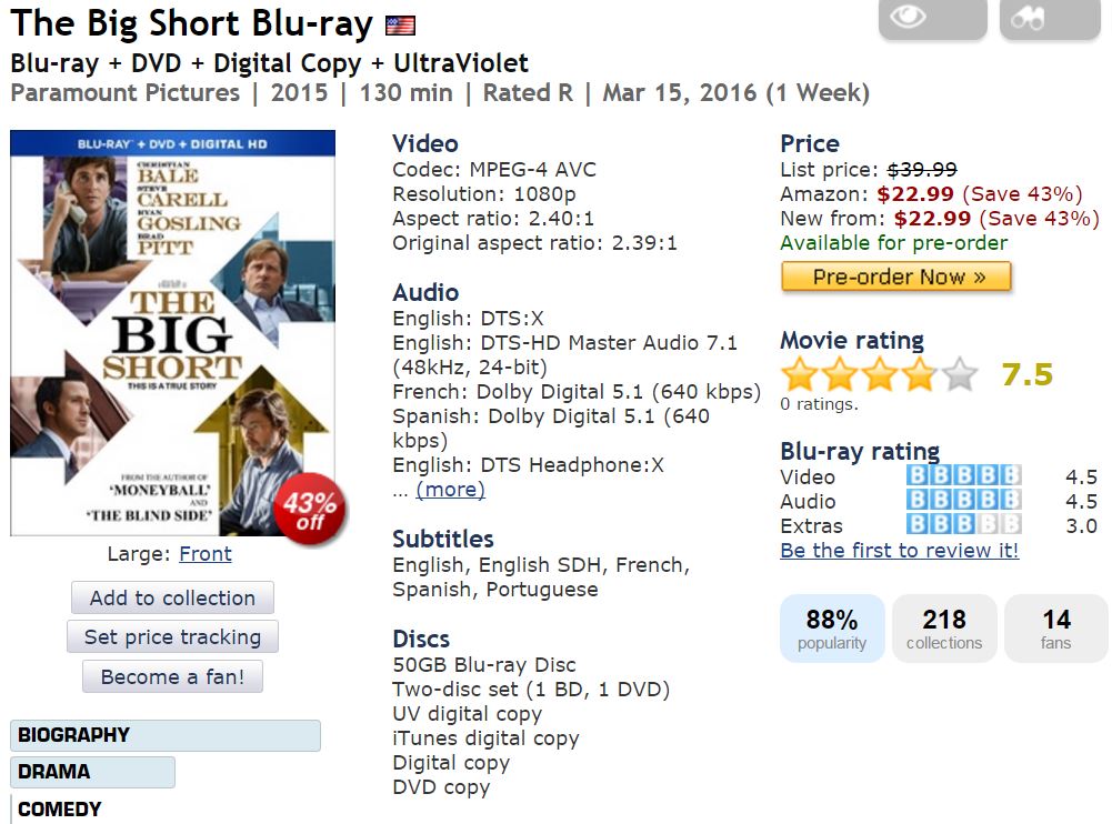 唔計非賣品示範碟,早前推出了四隻擁有DTS : X 聲軌藍光碟,今日市場上有第五隻 DTS:X 藍光碟可以買到。第五隻正是下圖所見,名為 The Big Short 的藍光碟。唔知這電影是否好看呢?根據臥底所講,呢隻水貨碟正以$240 港元發售中。