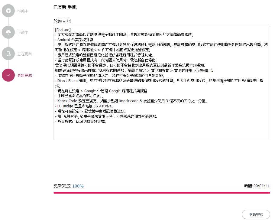 剛剛是電腦那邊在更新時情況,手機呢邊係點架呢.? 在更新過程裡,手機一直只需要接著USB線到電腦一方就可以,無需在手機裡回答或輸入任何資料,全程不需理會手機。