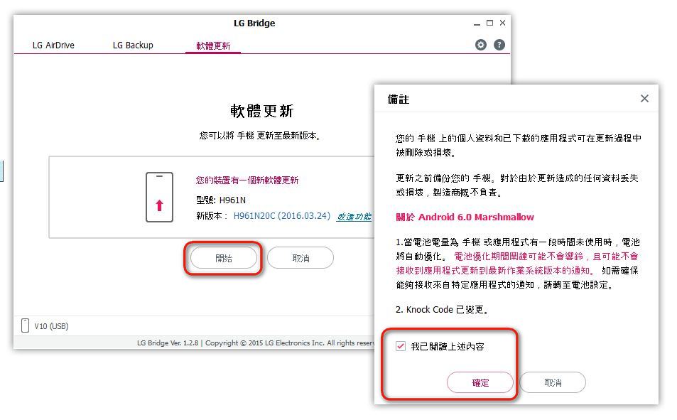 今日跟大隊尾把 LG V10更新成 Android 6.0 ,更新當然不是透過手機體內被動的OTA 通知吧,而係透過自己主動電腦接駁 LG Bridge 。