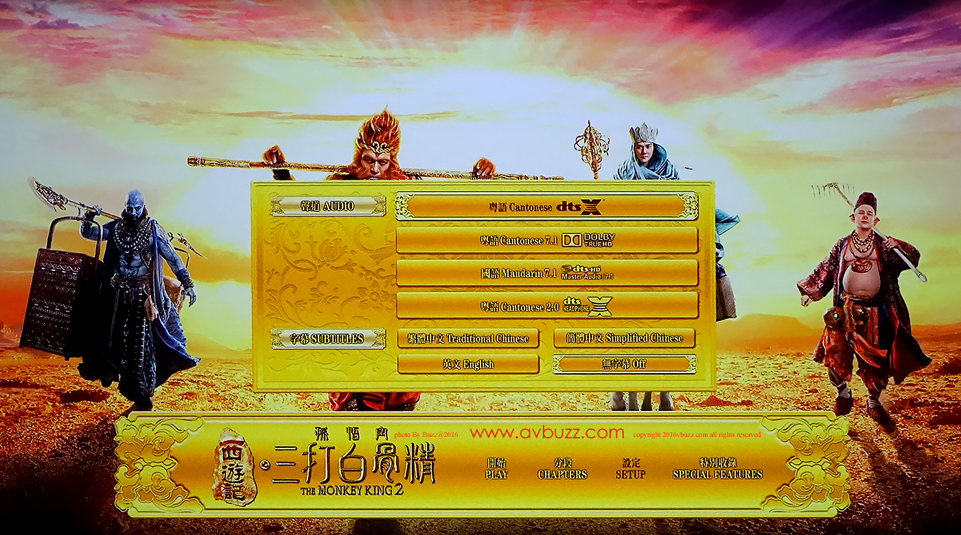負責混音及藍光碟製作的嘉耀製作有限公司,近期又有新搞作,繼早前為葉問3 藍光碟加入 DTS: X 聲軌後,即將推出的 西遊記之孫悟空三打白骨精,也同樣擁有 DTS: X 聲軌,不過今次還加入 DTS Headphone: X 聲軌,這是屬於華語電影,首隻擁有 DTS Headphone: X 聲軌藍光碟,圖中所見是這碟主頁菜單,鮮黃色非常搶眼。
