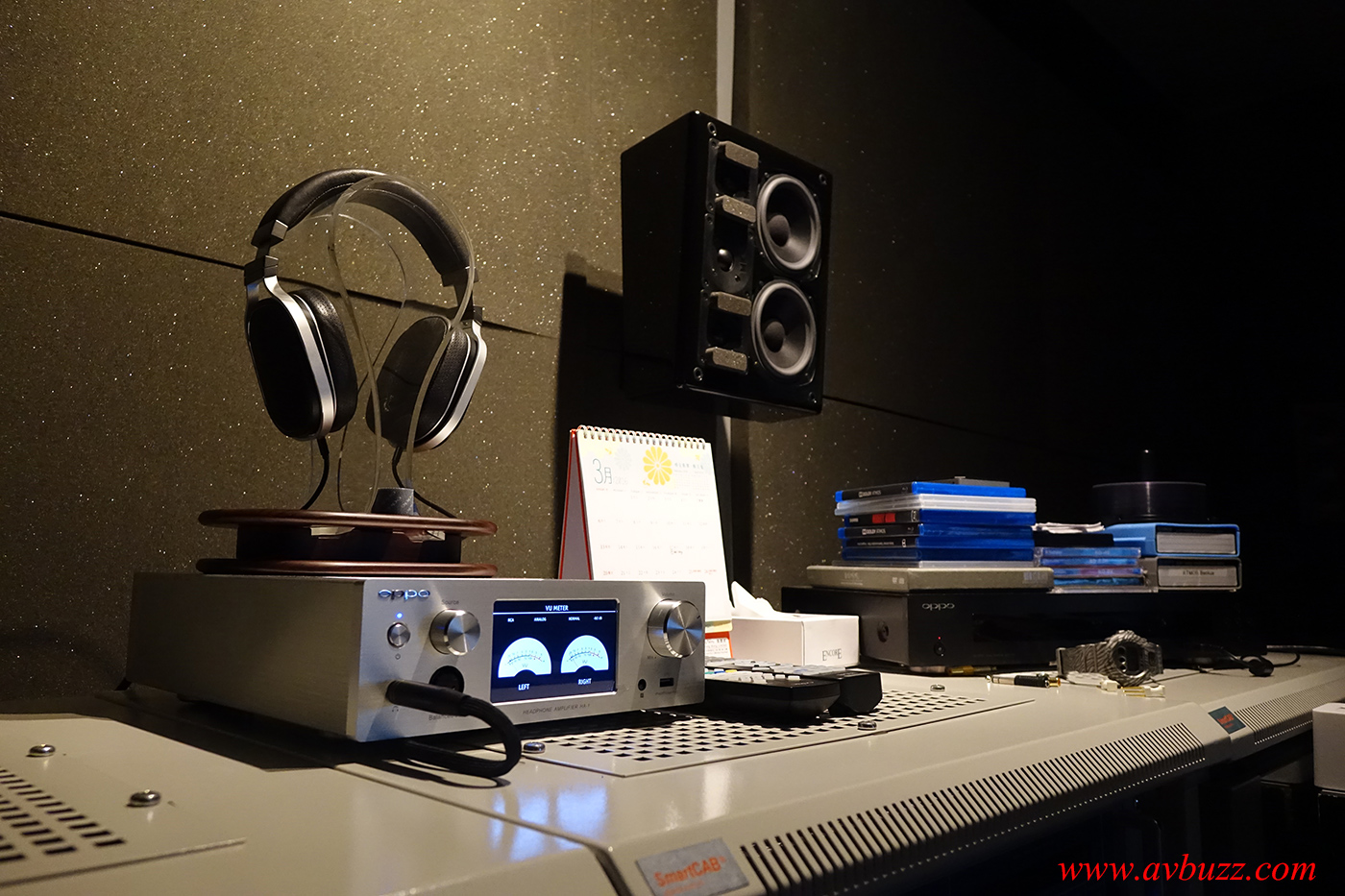 圖中可見混音房桌面,多了一組耳機連耳擴。她們正是 OPPO PM-1 耳機 與 HA-1 耳擴。DTS Headphone: X 強項正是本身聲軌就存在11.1聲道效果,用戶只要用平日用開聽歌耳機,或用在手機上的免提耳機,都能重見11.1聲道效果。