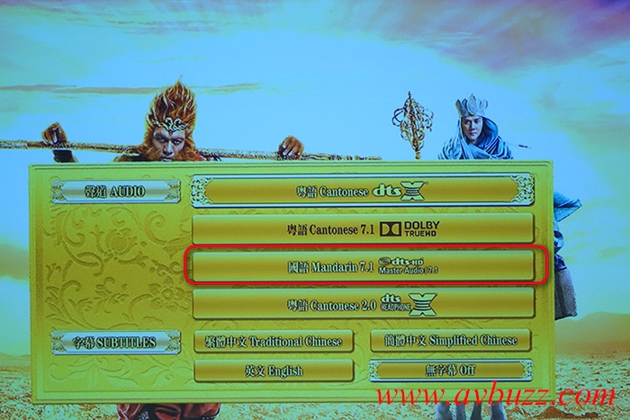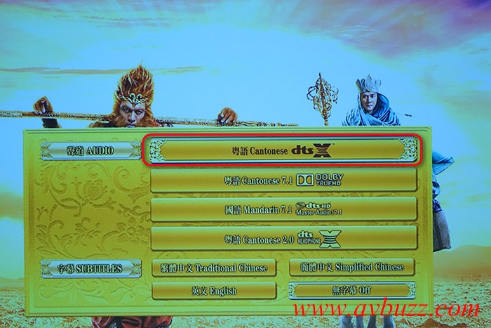 菜單上可見一共有四條聲軌,當中包括 DTS: X 與 Dolby True HD 7.1 粵語聲軌各一條,還有一條 DTS Master Audio 7.1 國語聲軌。心水清的朋友一定留意到,想欣賞這碟 DTS : X 效果,粵語聲軌是唯一選擇。