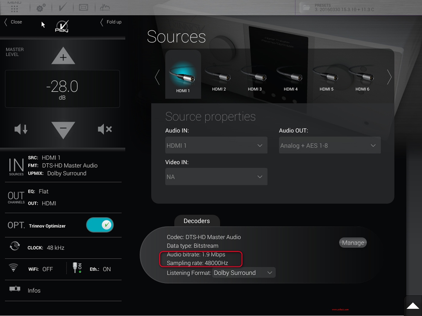 試聽實體喇叭前,還是想多聽一次 DTS Headphone: X 效果,今次不再用耳擴,打算用耳機直插 OPPO 105D 藍光機聽效果。在菜單選了 DTS Headphone: X 後,透過 Trinnov Audio Altitude 32 操作介面可見這聲軌數據資料。