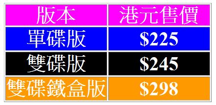 他說鐵盒裝售 $298 港元。另有普通裝預訂,分別有單碟版與雙碟版,單碟版售 $225港元,而雙碟版為 $245 港元,兩者差者$20 ,就是相差一隻製作特輯碟。喜歡這電影的朋友,不能錯過這套藍光碟啊。