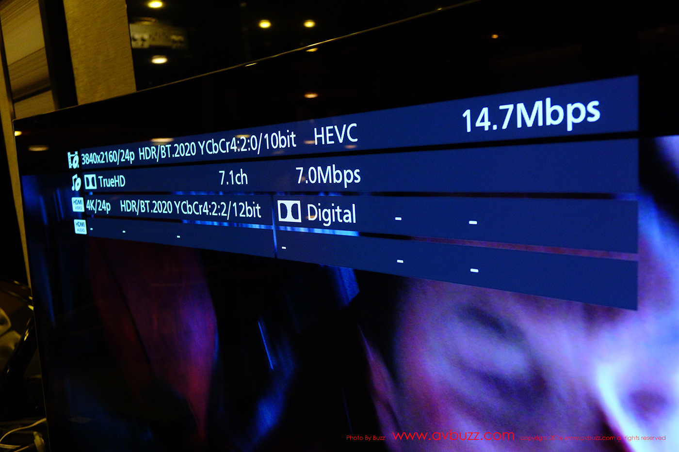 這碟碼率顯示數值一閃即逝,可能有更高數值,始終是看電影,而並不是看數值,所以無全碟看一次數值。圖表最上第一行是訊源畫面的資料,第二行是訊源聲音的資料,第三行是畫面輸出的資料。