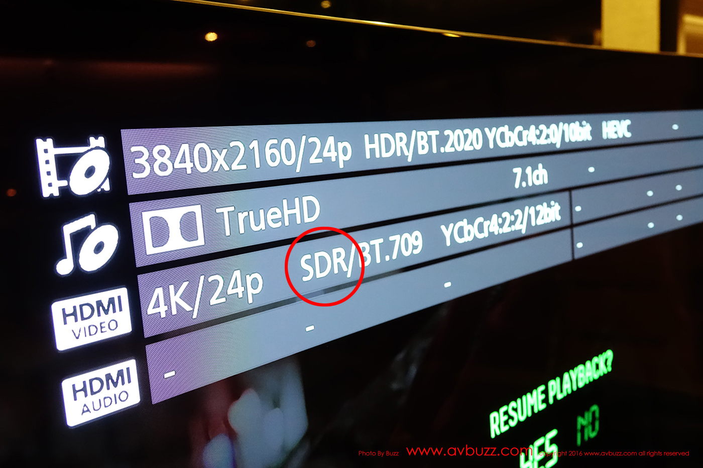 起手式,當然不會播放最大賣點的 HDR 吧,在SONY 電視裡,關閉 HDR 模式,先來看 SDR 模式,圖中可見第三行的資訊正以 SDR 方式播放這碟。