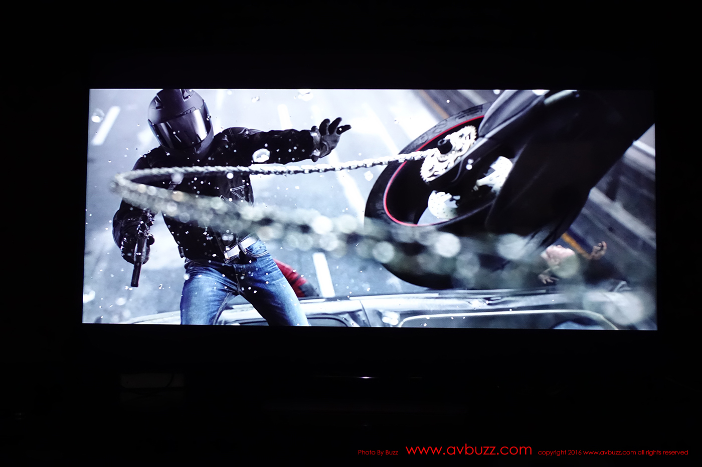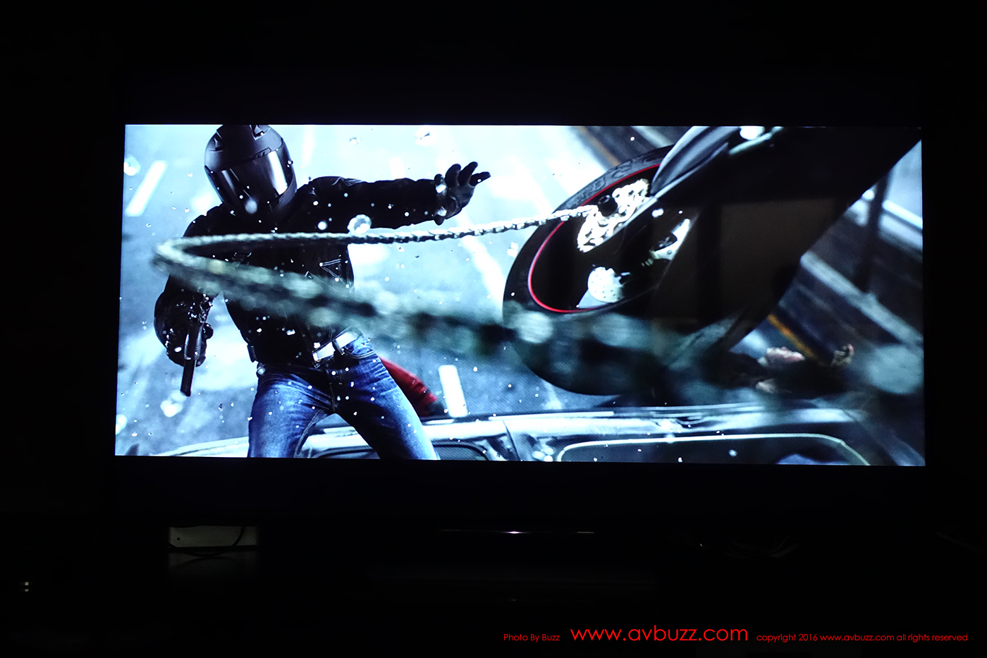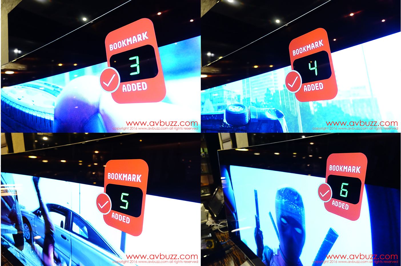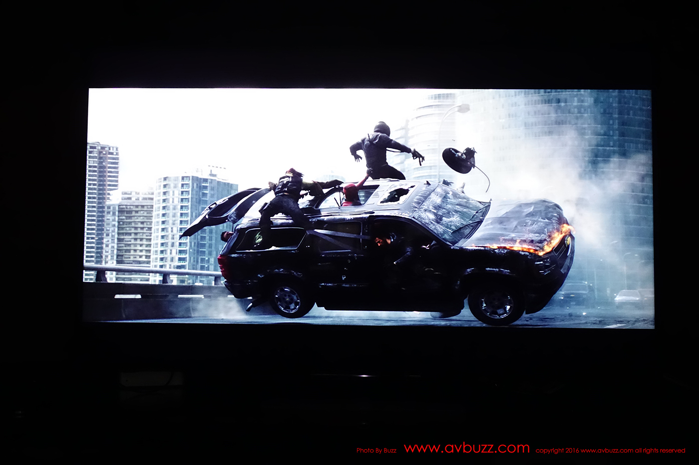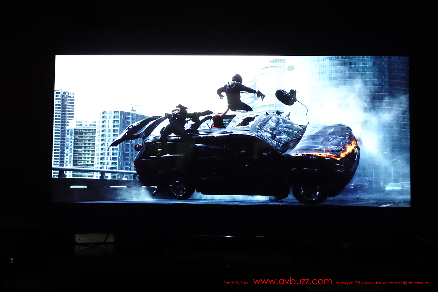 下圖所見是 HDR 效果,留意同一畫面的車身側面暗位,剛剛在SDR 模式下的一堆黑色,現在可見到車頭燈,還有伸出車外的司機,來到後座的安全帶….都能得到重現。而剛剛在SDR 模式下 1:00 方向白煙,在 HDR 模式下,後面建築物窗戶得到重現。 HDR 模式下,充份能表現黑中黑,白中白,並重現光或暗位裡的細節。