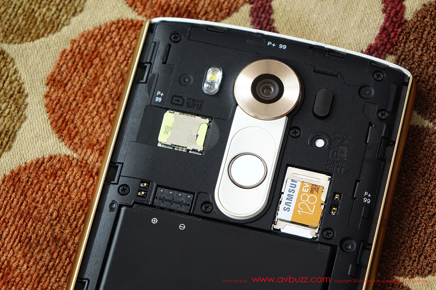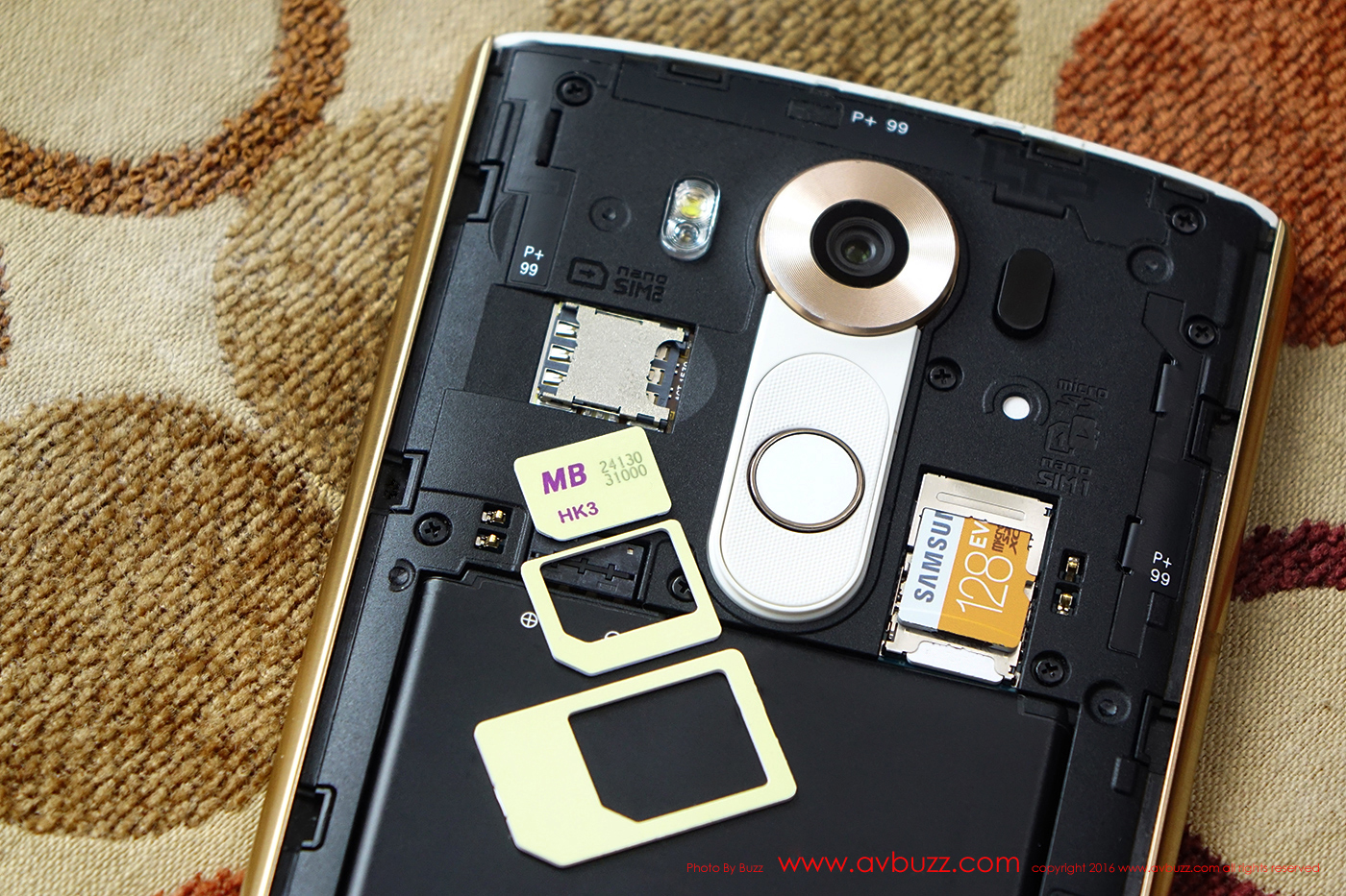 LG V10 屬於雙卡雙待 Nano SIM 款式,右手邊早插著香港每日使用的 Nano SIM ,圖中左上角卡槽,正等待中港數據專家數據卡的插上,這張三合一SIM 卡,徒手便可把卡分離成適合LG V10 所用的 Nano SIM。