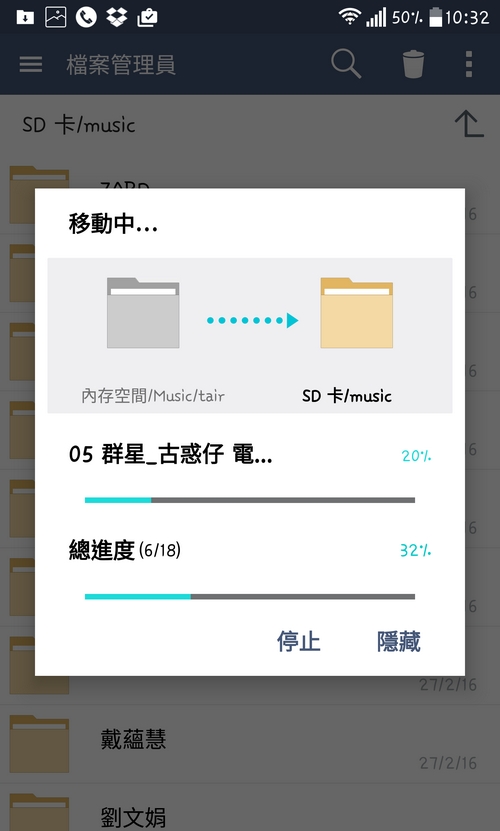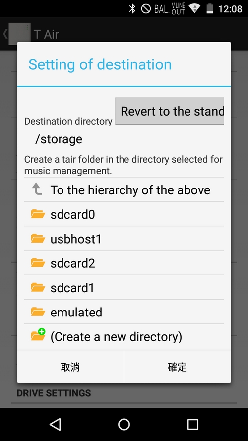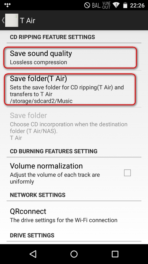 雖然「T Air」可設定擷碟後存放歌曲目的地,但其實最終係不能決定目的地是外置卡,首目的地,必需是內存,iOS 機當然無呢個問題啦,因為根本無得插卡,但 Andorid 雖然有得選,但唔Work。右圖可見,在 Onkyo DP-X1身上可見能選擇歌曲存放目的地,但結果是失敗,而LG V10直頭無外置卡路徑。無所謂吧,每次把內存完成的檔案移去外置卡,也只是多篤兩下,零難度。