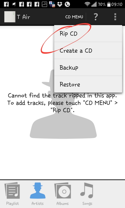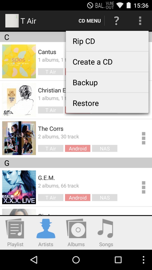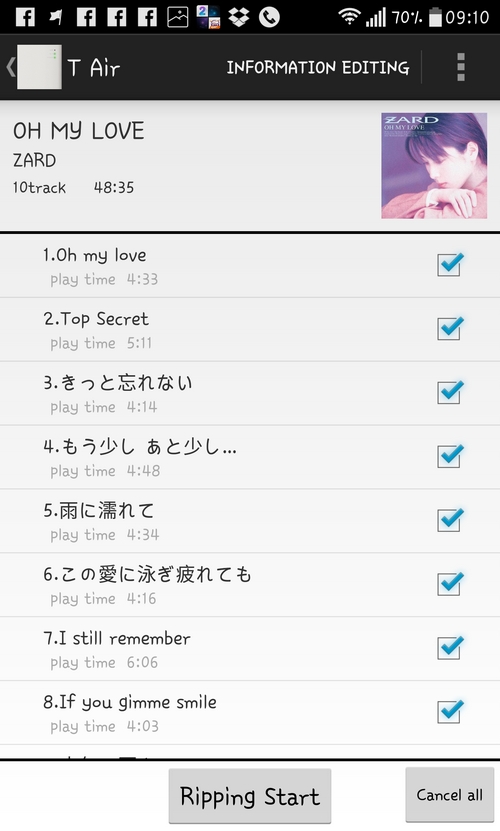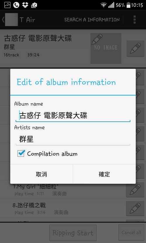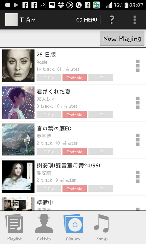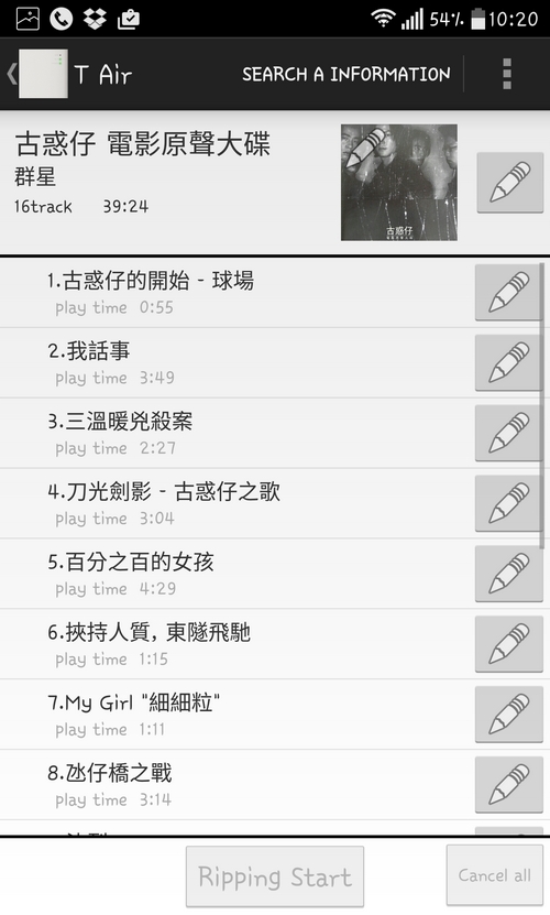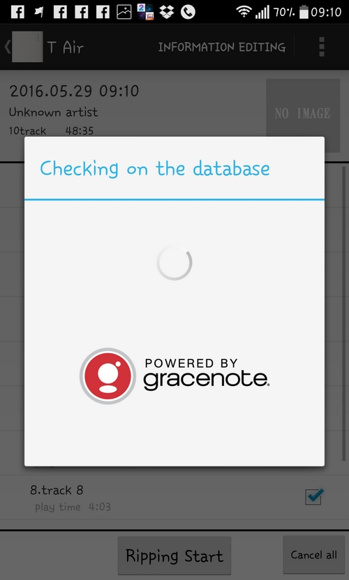 「T Air」最吸引我是她所用的歌曲 Database 是來自跟 iTunes 一樣的天下無敵 Gracenote ,找曲目可是銀河系最強,找到歌曲資料,並提供埋封面,10首歌7分鐘內得手。正如上述提到,流動裝置連接「T Air」來Rip CD,「T Air」接上網去 gracenote 取歌曲資料,就係咁簡單,只要搞清楚,便很易完成。