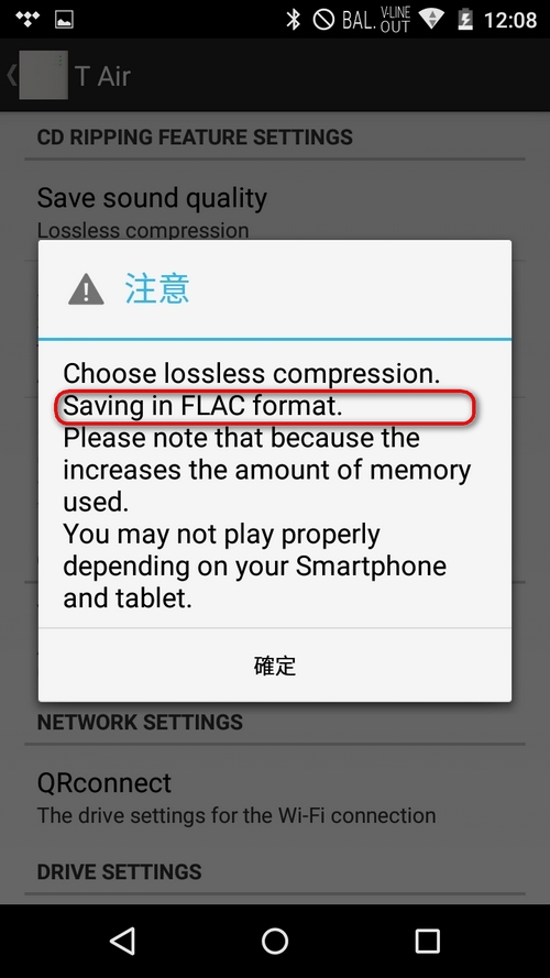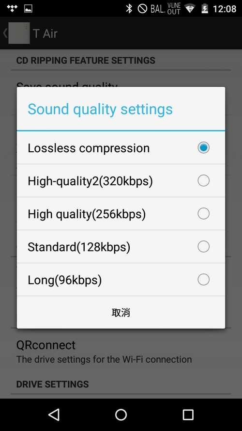 「T Air」強項之一,是提供兩款無損擷碟音樂格式, Andorid( FLAC)或 iOS( ALAC),ONKYO DP-X1屬於 Andorid,所以其擷碟後的無損音樂檔案格式是 FLAC,擷碟前可在 app 內選擇完成品質素,當然有大食大選擇無損音樂格式啦。下圖為 Andorid 操作介面,提到最高保存音質是以 FLAC 作為無損音樂檔案格式。