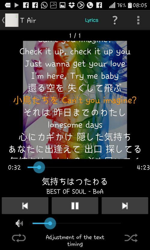 還有用橙色字來代表追踨的歌詞,大部份英語和日語歌曲,都能提供到歌詞。