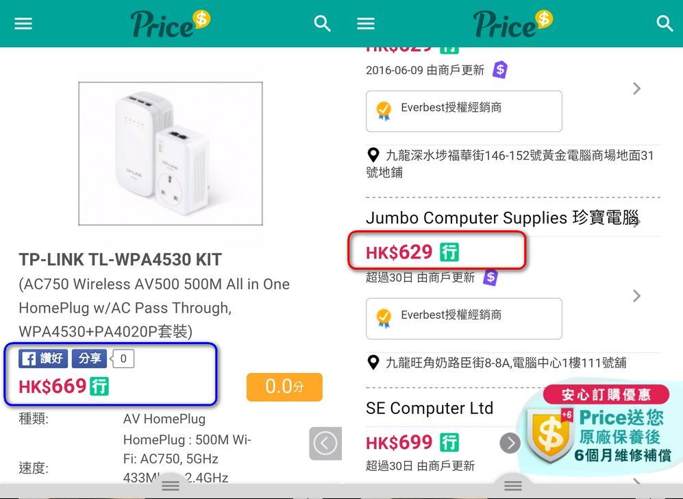 近年 Home Plug 技術一再提升, TP-Link TL-WPA4530- KIT 是我鎖定的目標,她強項除利用早就存在的入牆電線,達到等同 LAN線效果外,還提供無線 Wi-Fi 訊號分享給其他網絡裝置用。官方零售價港幣 $778,公平競爭法下,在格價網掘到最平 $629,Go~Go~Go~