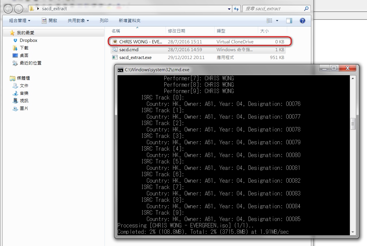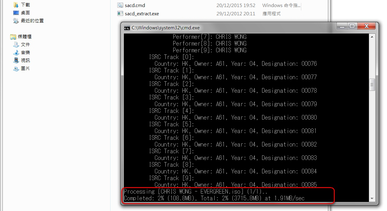 心急的話,可再去桌面 sacd_extract 檔案裡,可見到這隻 SACD 的成品正在建立中………..