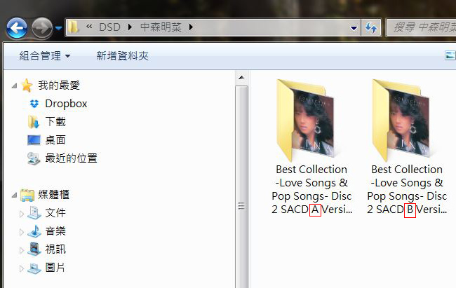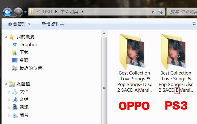 我沒有出席當日活動,在家中把國仁早前用他手上的 PS3 ,幫我把日本版中森明菜 Best Collection -Love Songs & Pop Songs 與 OPPO Rip 出來版本作比較。圖中所見兩個檔案,一個命名是 A ,另一個是 B 。正是分別由PS3 和 OPPO 所 Rip 出來的檔案。