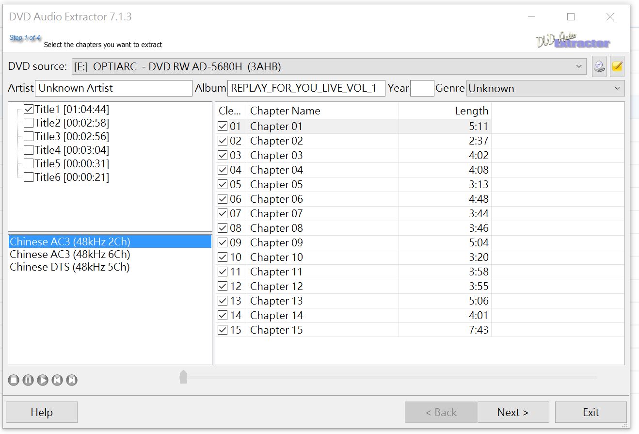 透過 DVD Audio Extractor 軟件可見這DVD一共有三條聲軌,應該抽出那一條聲軌,不難理解吧,可惜三條聲軌都不是LPCM。雖然我沒有CD版本,但單獨去欣賞這碟的音色是非常之好,現場環境聲音收錄得很自然,低音有力,樂器聲與人聲很清晰 ,使人一聽再聽,滿意度爆燈。