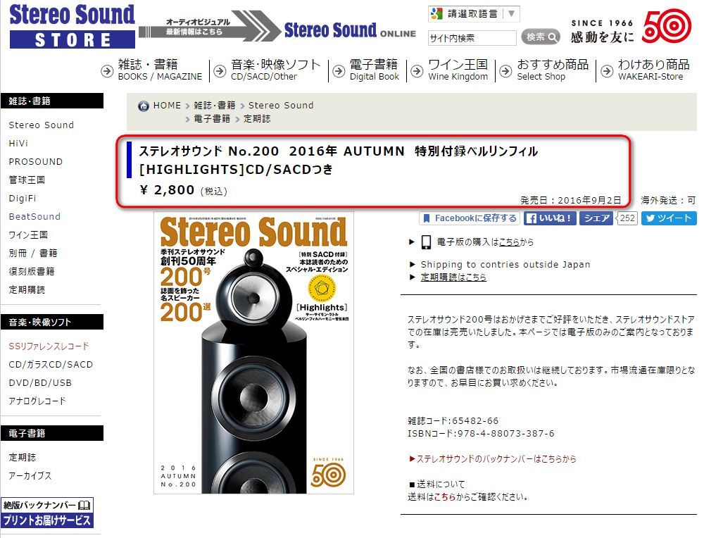 Stereo Sound 慶祝創刊 50週年,並在9月初推出的第200期,跟書附上 SACD 一隻,書的厚度也加厚了,平日賣開每本 2160円,今期賣 2800円 ( 未計 8%消費稅 ) 。