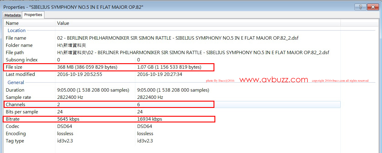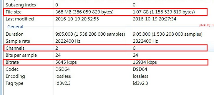 兩聲道與 5.1 聲道,兩者在體積上的差別是非常之大,就以下圖所見,可比較到碟內第二首曲目,兩者容量很大差別。
