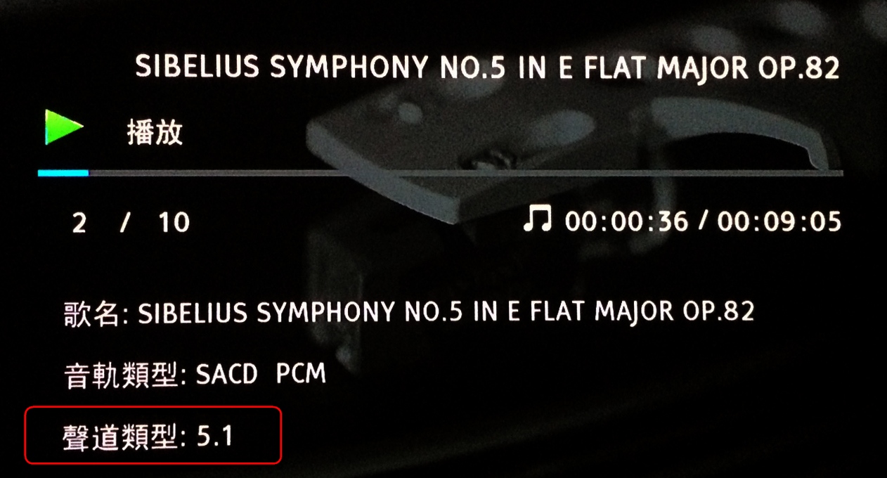 放在 OPPO BDP-103 上播放 SACD 層,可見到當中有 5.1聲軌的出現,所以封背可見到 SACD Surround 字樣的出現。