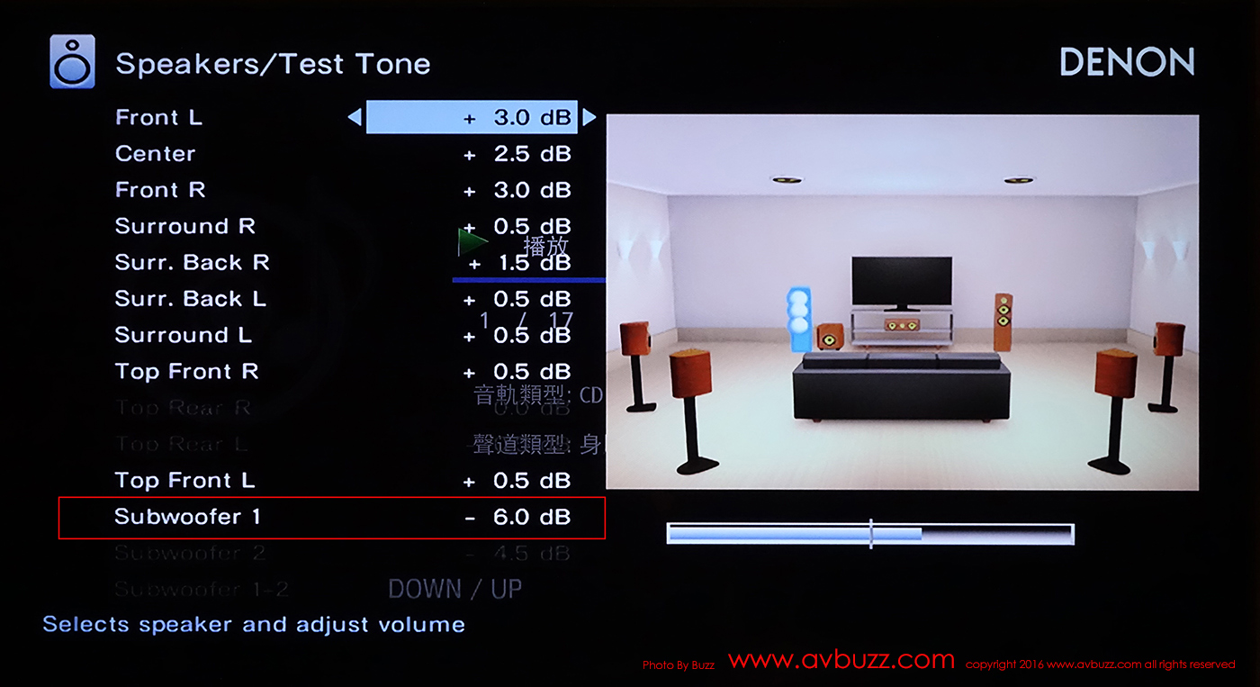 Denon 機聽歌之所以討我喜歡,就是她以 2.1 播放音樂時,低頻量可以作出獨立調節,而不影響原有家庭影院多聲道的數據。2.1 聽歌時,用家可以在遙控器上按 Option鍵,就輕易來到 Channel Level Adjust 。