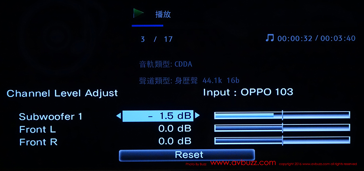 在細房間用 Av amp 的 2.1 聽歌也是其一強項,但先決條件是低音炮的質素要比較好,方能夠發揮自然。Denon 機當然擁有聽歌所用的 2.1 效果,低音炮是伴著左右聲道而出,今次訊源來自 OPPO BDP-103,以CD播放。