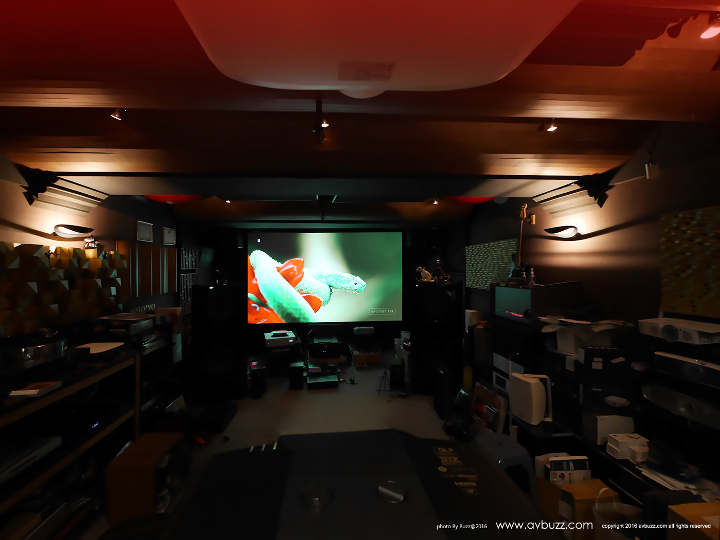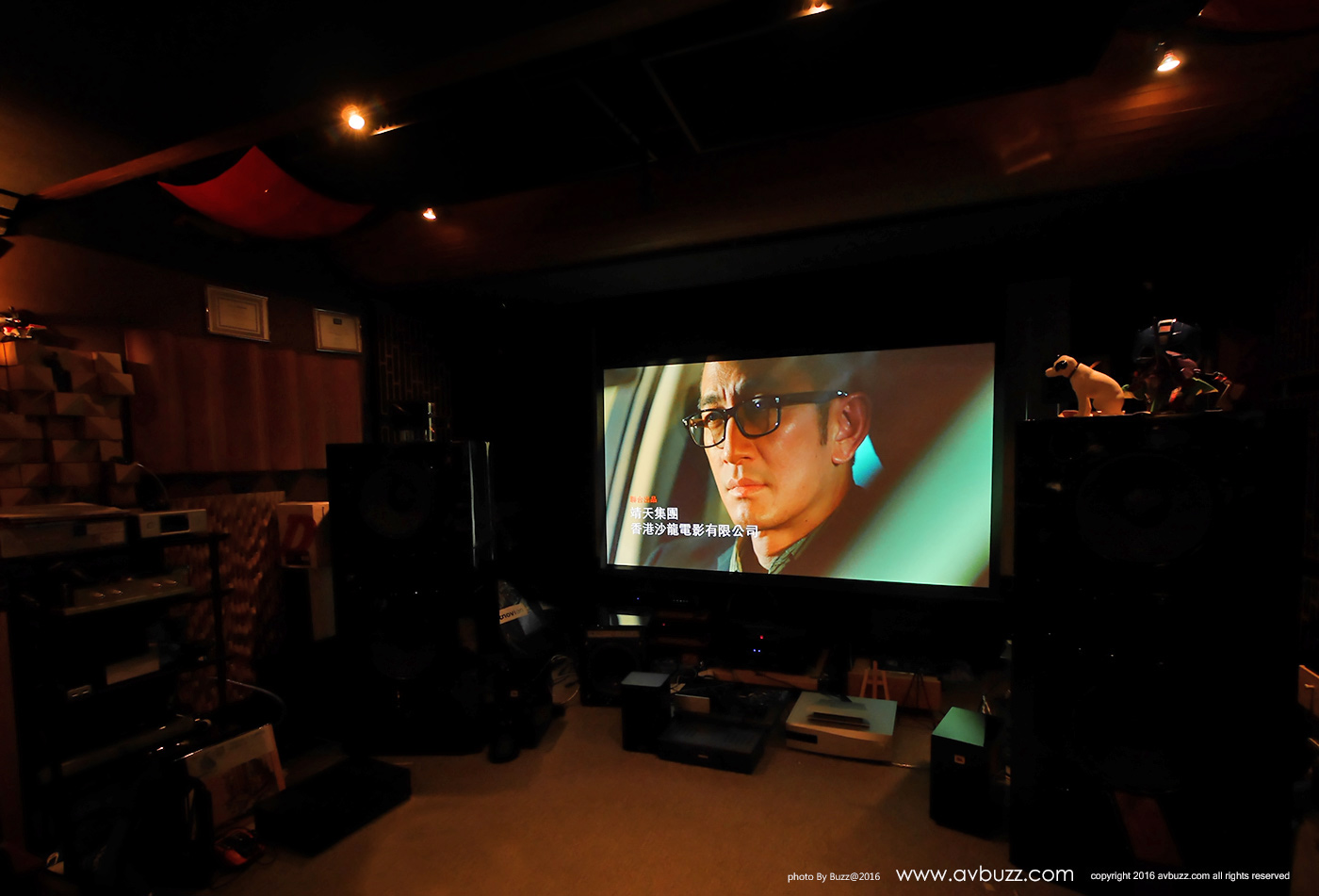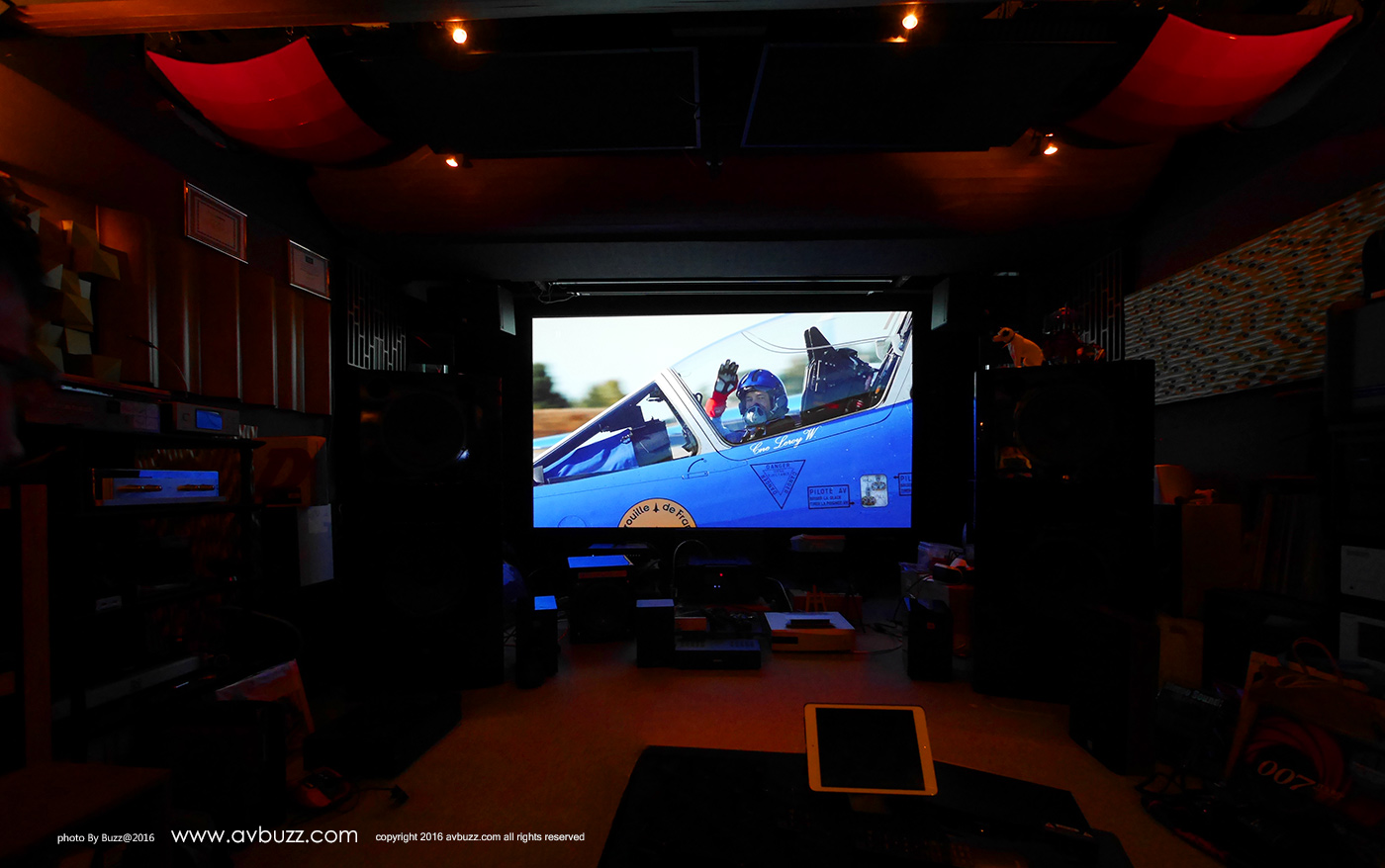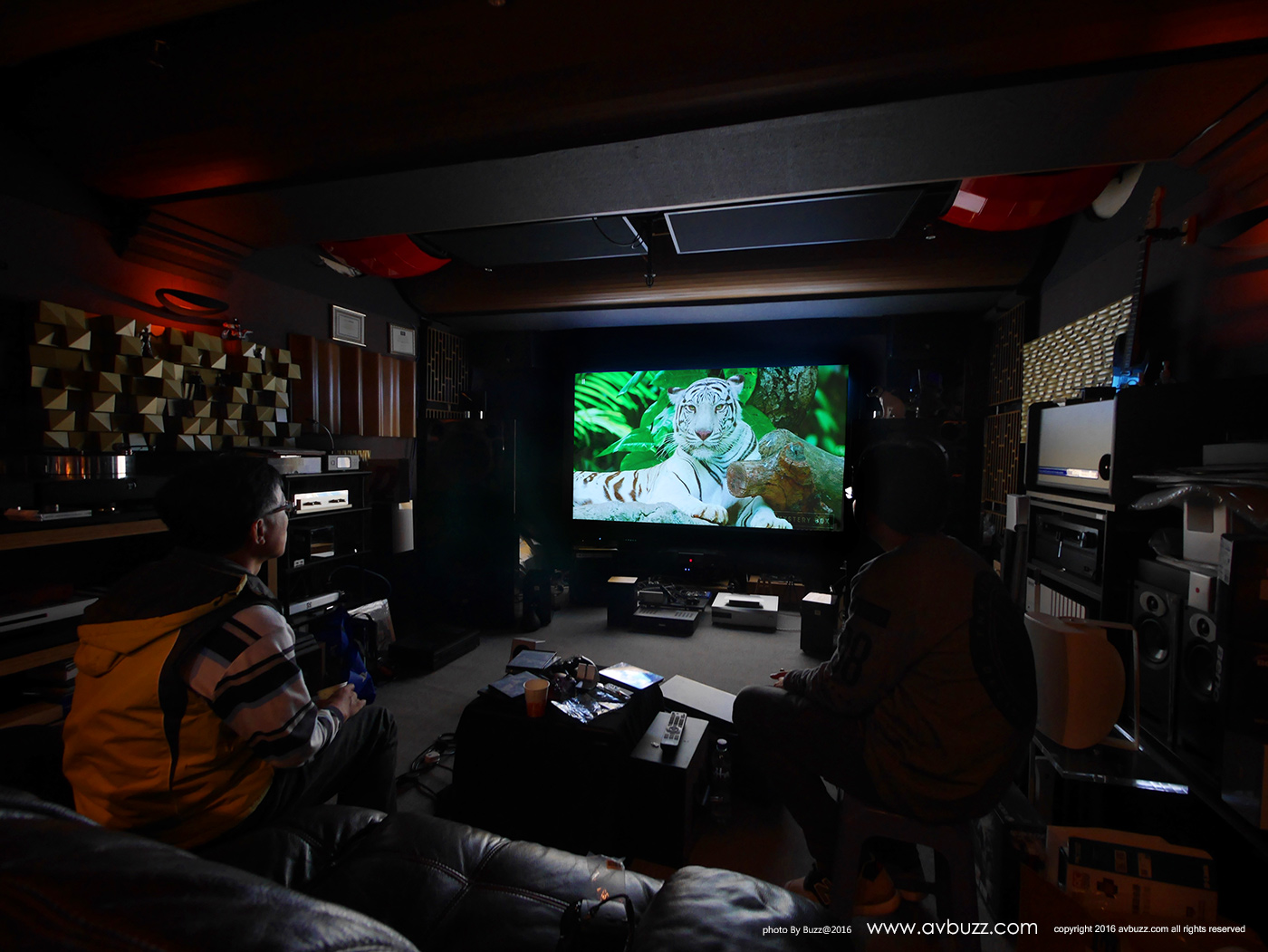 正當我和 Brian 非常投入這個 16:9 140吋透聲幕時,數碼奇雲突然 說給我倆使用高增益幕欣賞,是屬於 16:9 100吋 OS 超微細玻璃珠 Premium White (BU-201) 電幕,增益為 2.7 ,啊~~~2.7 咁高? 我和Brian互望後,第一個反應就是跟大家一樣想到 hotspot 問題。數碼奇雲陰陰咀笑而不答,叫我們用眼來收貨。結果超驚人的畫質出現在我倆眼前,在沒有調校過 BenQ W11000 本來投放到 0.95增益幕上的設定,只是按 OS 電動幕下來,畫質無論通透度,顏色艷麗度,金屬感,陽光感……..,都遠遠超過剛剛我們所見畫質,直迫電視機 80% 效果,hotspot ? 那裡能找到?