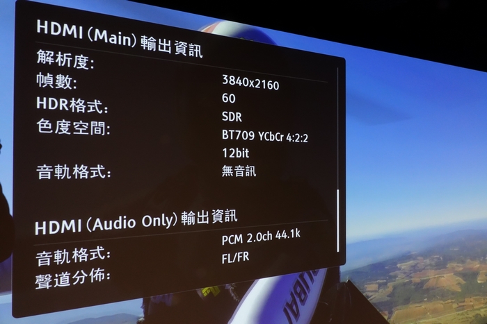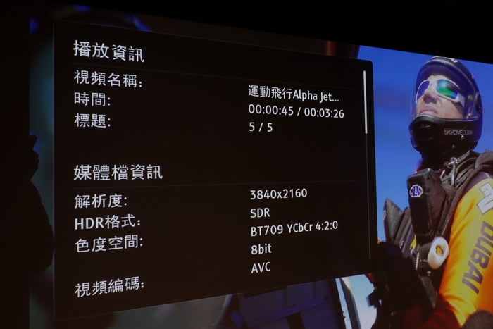4K 示範片段還有 Alpha Jetman – Human Flight And Beyond ,這一段充份表現出動態和其顏色表現,透過 OPPO UDP-203 所提供到的資訊可見這片段是屬於4K 60FPS ,正以影音分家方式輸出,並由 8bit 4:2:0 訊源提升到 12bit 4:2:2 。