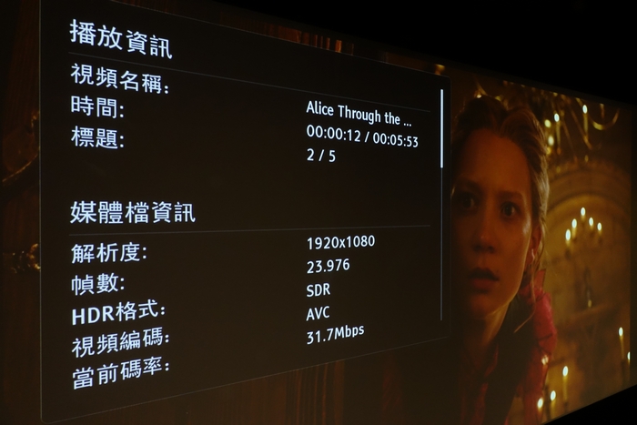 這日安排了透過 OPPO UDP-203 ,以 2K 轉 4K 給大家欣賞,2K訊源找來 Alice Through the Looking Glass ( 愛麗絲夢遊仙境2:穿越魔鏡 ) 。左圖可見訊源是 1920X1080 ,右圖可見經 OPPO UDP-203 提升為 3840X2160 ( 4K ) 解像度,以 Barco Loki 4K 鐳射投影機重見超高質素畫面。