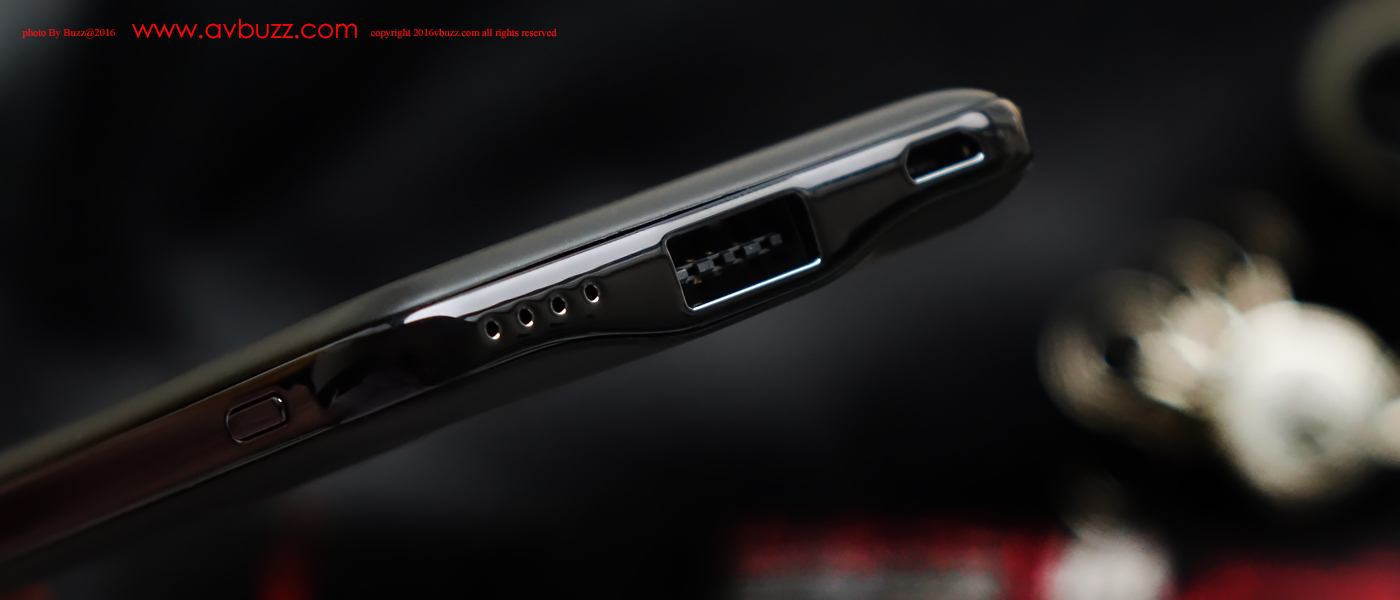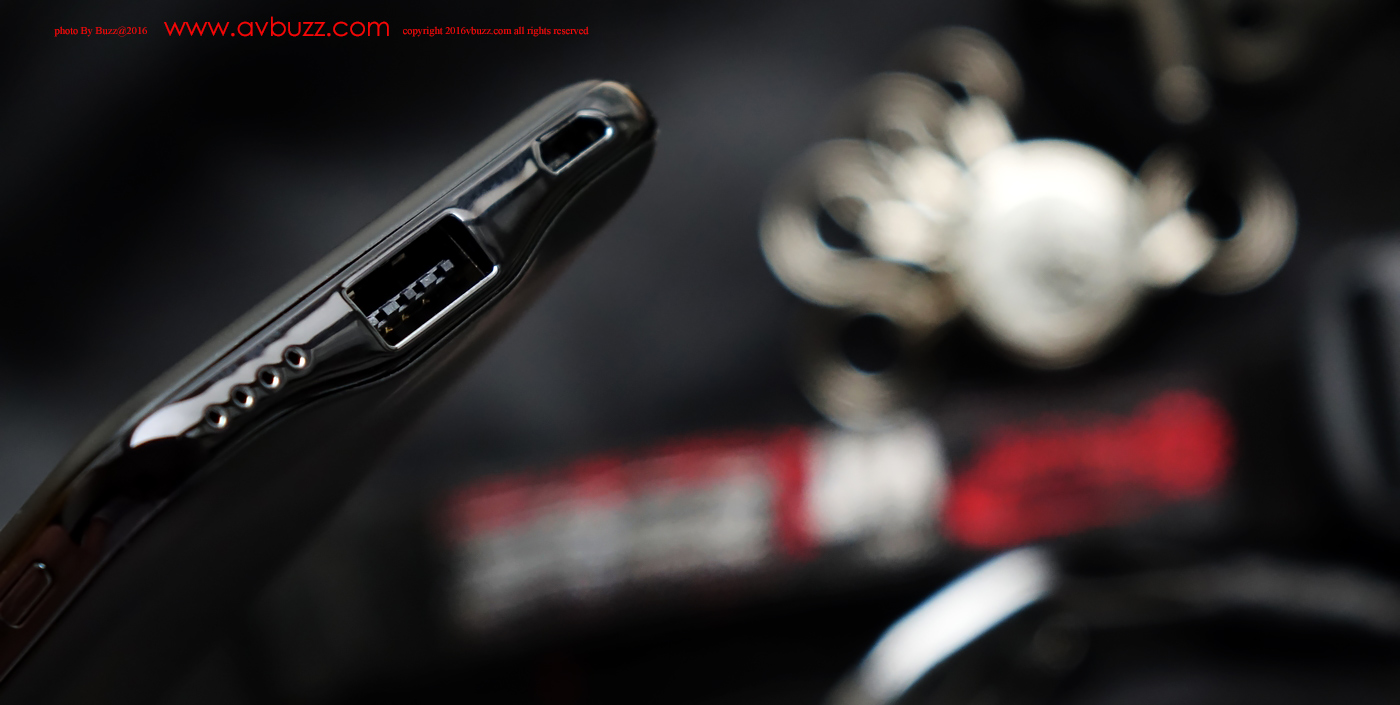 邊位並不是啞黑色,而是光滑邊,哈,這角度使我想起 黑武士頭盔 ^0^。心水清的朋 友一定會留意到USB 的結構有所不同,好眼力,正是雙面盲插設計,用戶插入USB頭時無需理會方向性,以人為本的好設計。這個USB接口屬大家最喜愛的 5V /2.1A 快速度輸出。