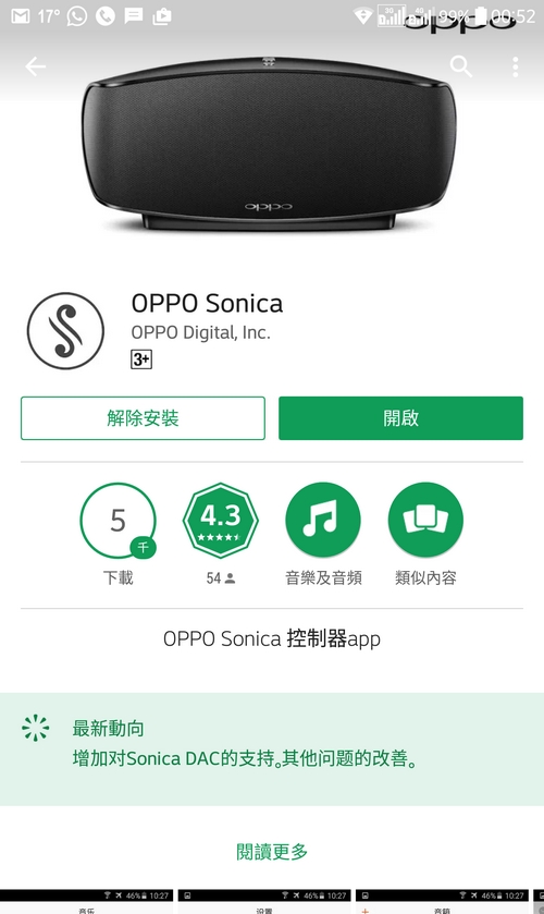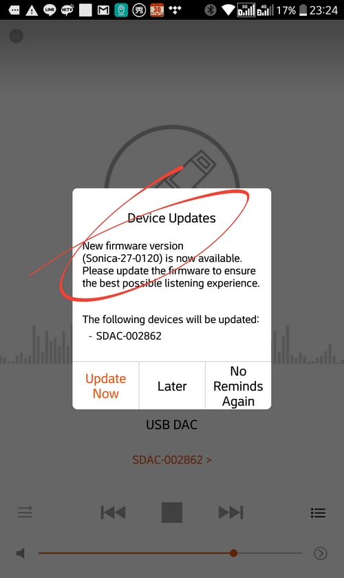OPPO Sonica 專屬 app 裝好了,Sonica DAC 機背的 LAN 線也接好了,手機立即提示有最新 Sonica-27-0120 固件升級。