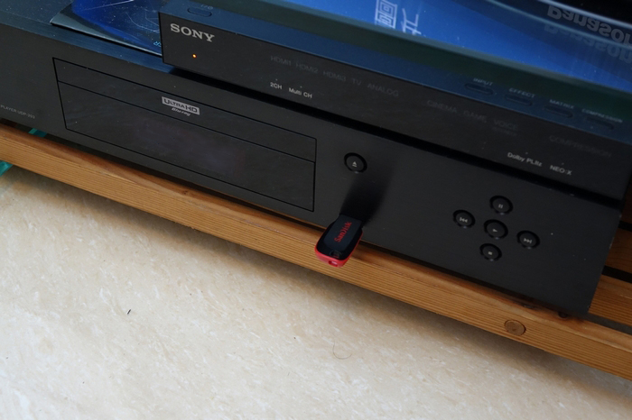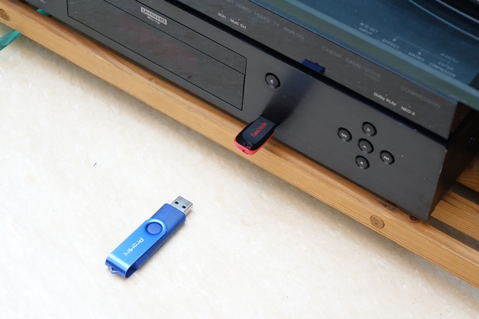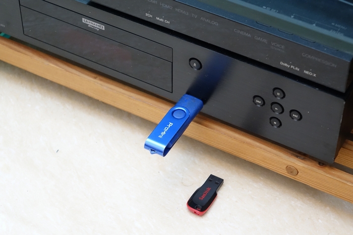 來到 OPPO UDP-203 機身面前 ( 暫不要開機 ), 拿走本來日日插在 OPPO UDP-203 身上的越獄 USB 手指 ( 圖中紅黑色 )。然後插入擁有越獄第二版的 USB手指 ( 圖中藍色 ) 到機身去,目的只暫借新插入的越獄第二版 USB手指來為機體更新。