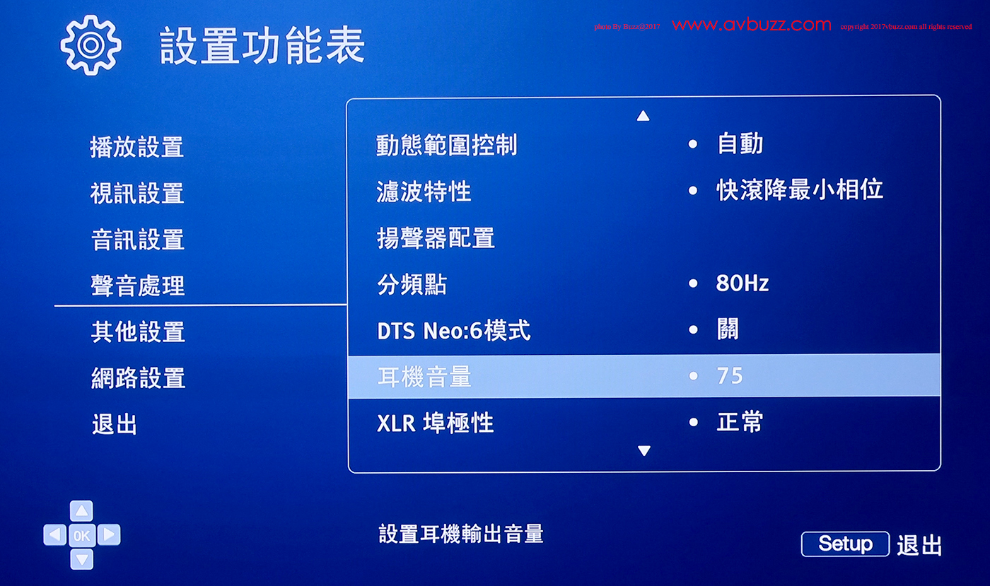 既然是耳擴,當然需要獨立設有耳機輸出音量設定吧。如舊在操作介面上可見由0-100,預設為75 。當然用家也可以用實體遙控調校方便很多。