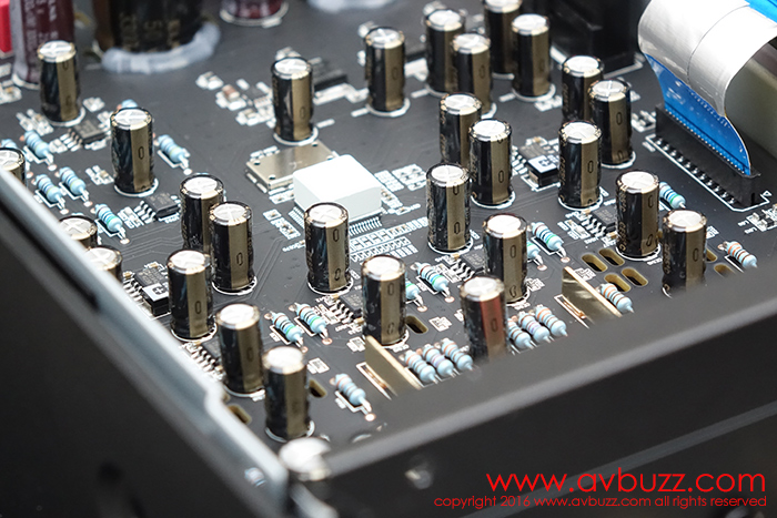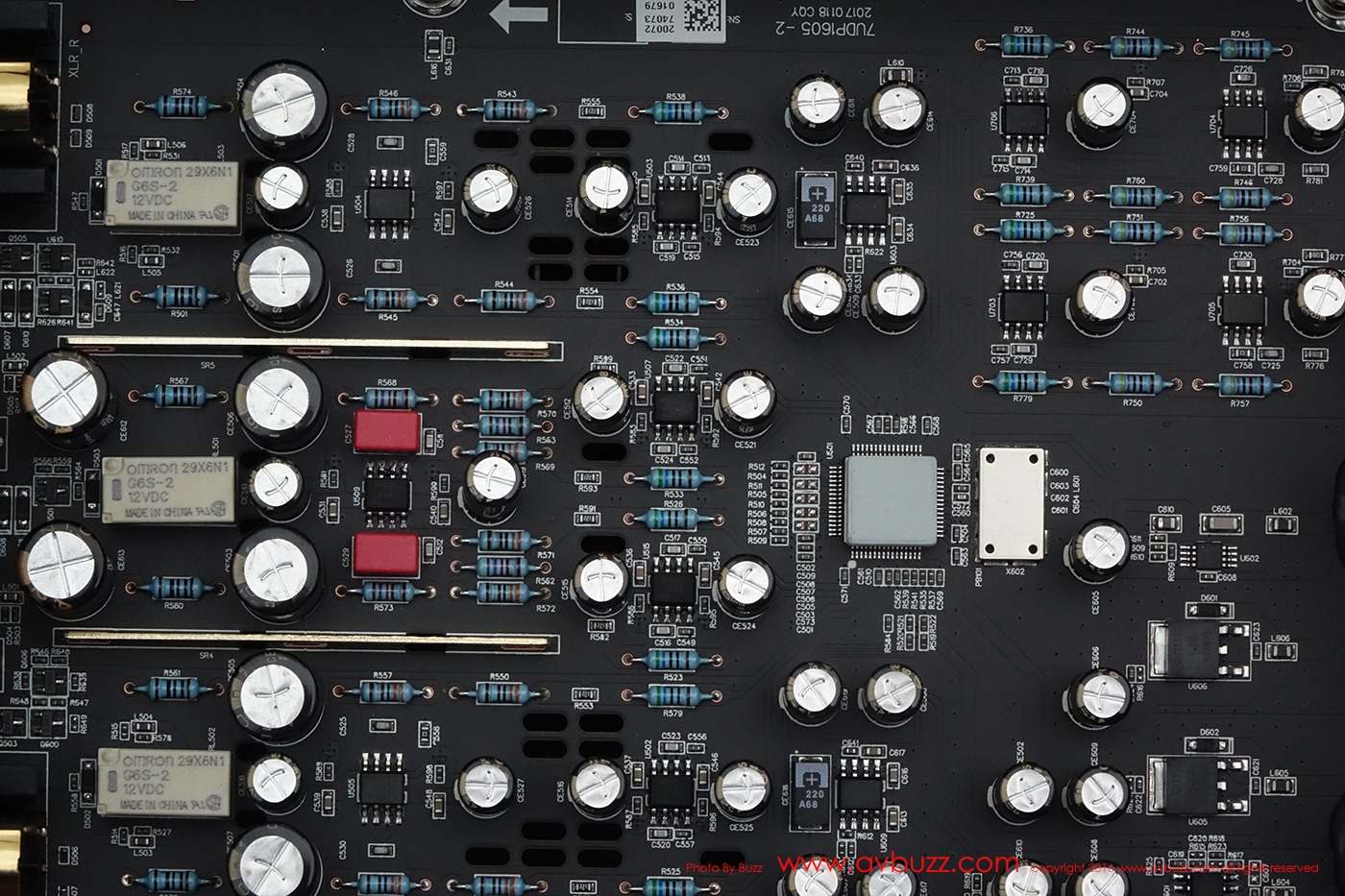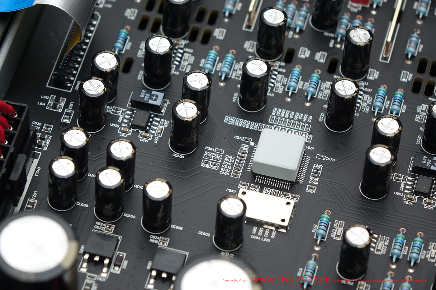下圖所見,位於模擬 7.1 聲道,與兩聲道線路板,分別裝上擁有八通道的 ESS Technology 32bit ES9038PRO 晶片,並支援 768kHz PCM/DSD 512 USB DAC 功能。