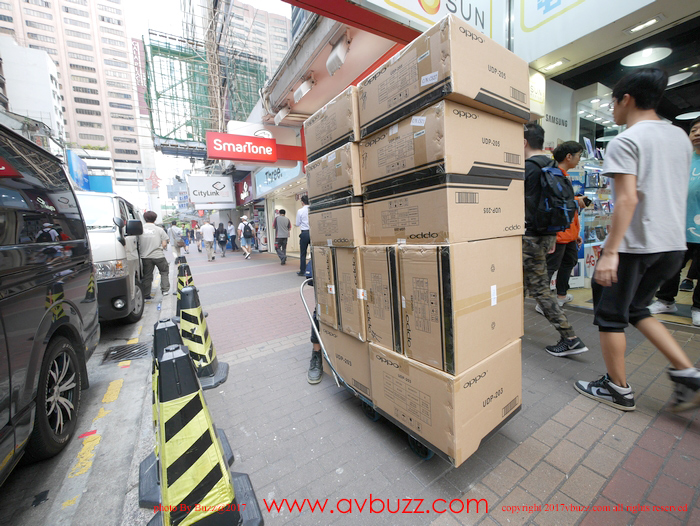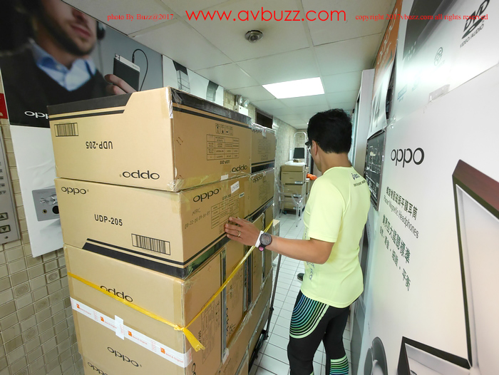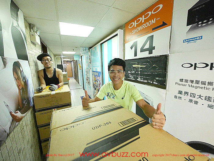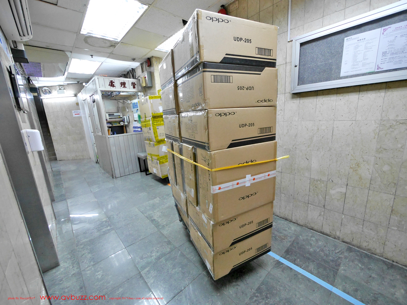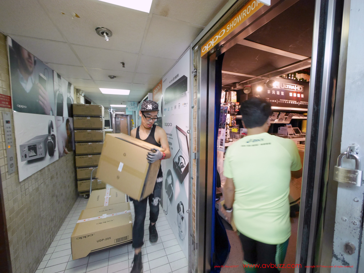5月15日星期一,對聲耀全音BO Acoustic來講是一個重大日子,因為這日是他們所代理的 OPPO 品牌,旗艦新型號 UDP-205 正式發售日。首批到貨數量並不多,一部貨 Van 分兩轉鐵車仔就可完成運送。落貨當日中午非繁忙時段到貨。負責運輸的朋友來到旺角陳列室對面馬路落貨。
