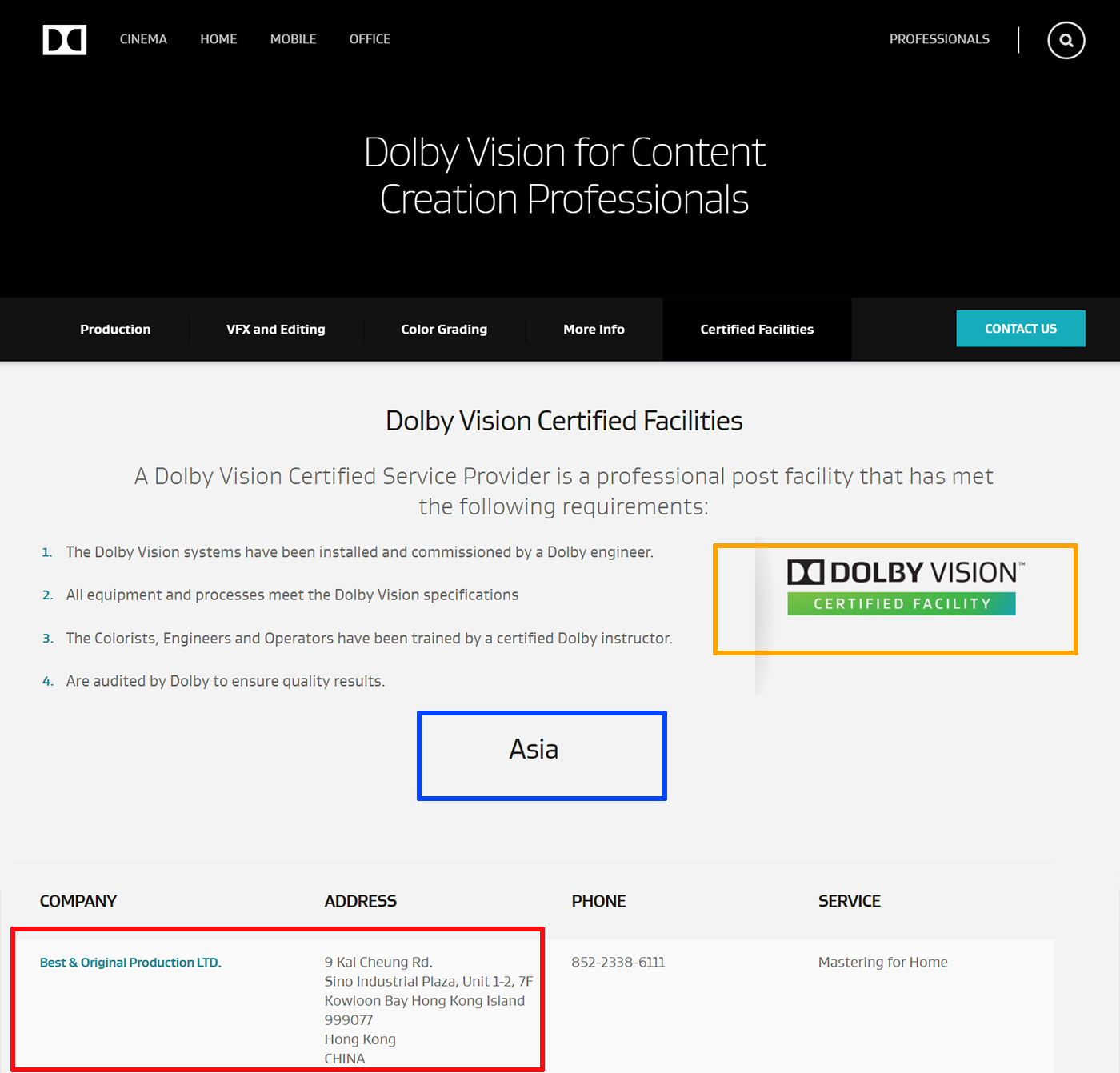 2017年的杜比實驗室,再不只是專注其聲效,在畫面方面也把握著領導地位,杜比實驗室對 DOLBY VISION 有嚴格而且正統的規範。要獲得製造 DOLBY VISION 技術,再不是人人有錢買部機回來造就可以,想擁有製造 DOLBY VISION 器材,技術人員首先要經過受訓,並考獲相關資格,杜比實驗室方會出售這器材到製作公司,大家不難在杜比實驗室官方網頁內見到,整個亞洲區,就只有 嘉耀製作有限公司 擁有這資格。今年2017 年1 月更成為亞洲地區首間Dolby Vision 認證的製作公司,為區內多間極具規模的內容供應商包括 騰訊 及 愛奇藝 等等…提供Dolby Vision HDR 製作服務。