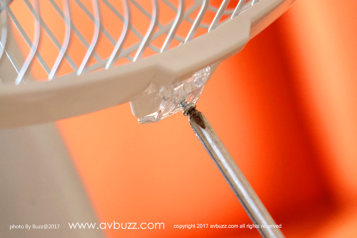 前網罩底部不但有安全扣,而且備有保險鏍絲,確保扇葉不會像血滴子飛出,什麼是血滴子?咳咳……..忘記吧。或者你可理解為,不會發生死神來了式意外,咁你會易明白D,哈哈哈哈……..。上述提到過組裝過程無需任何工具,但來到呢粒保險鏍絲,就需要工具了。