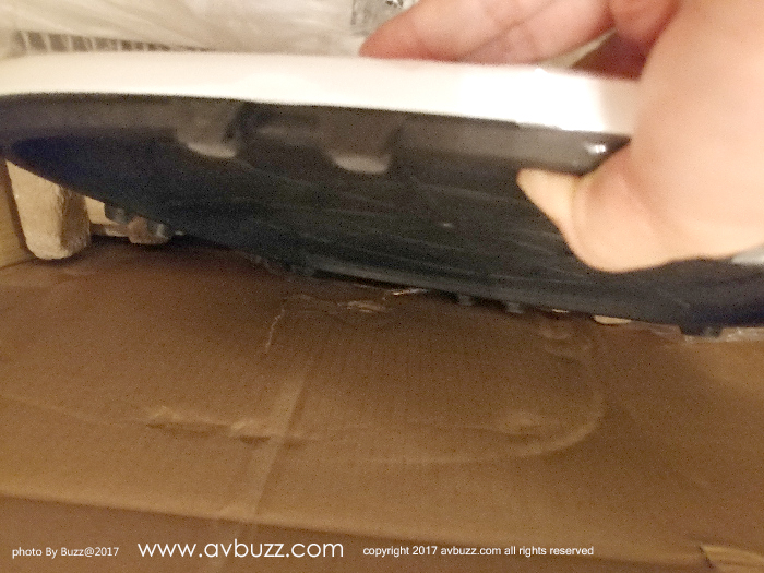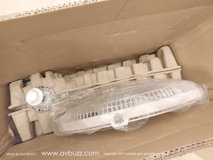 移走頂部發泡膠,可見內裡佈局,外箱受損位置,原來裡面是擺放底座的底盤,那就放心了。拿走底盤後,可見到風扇其他零件擺放狀態。