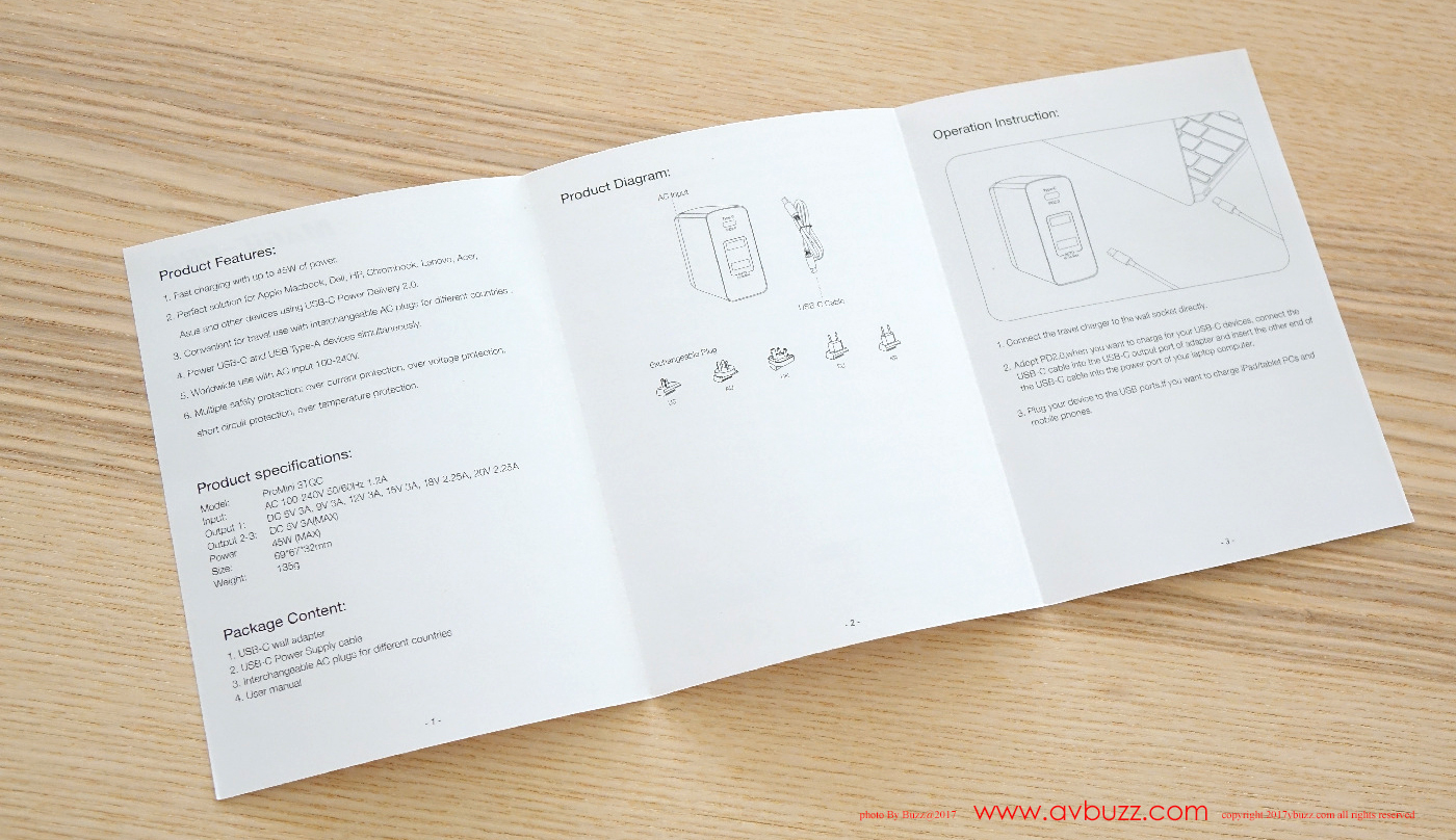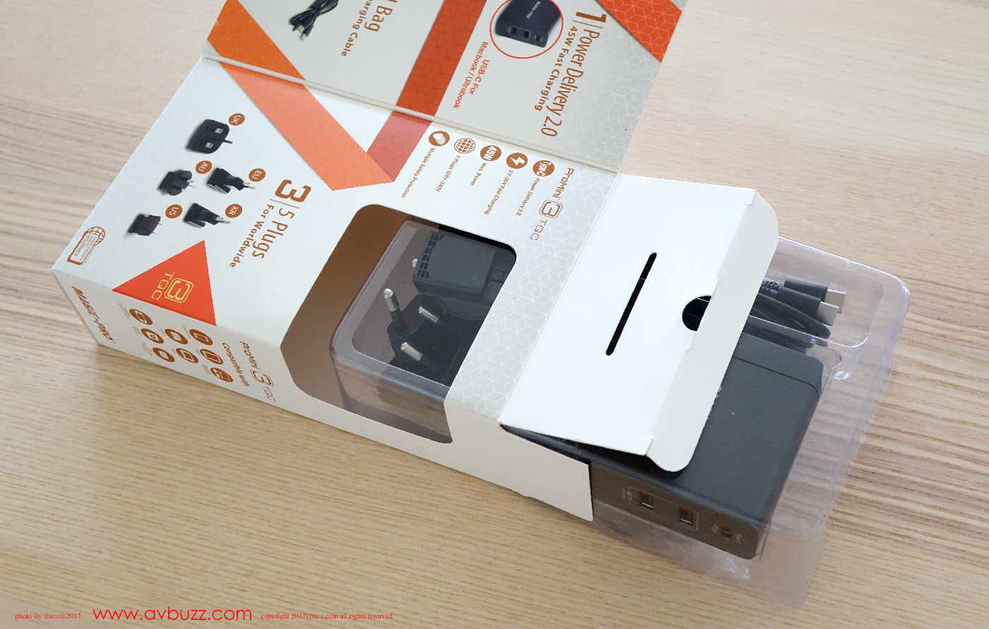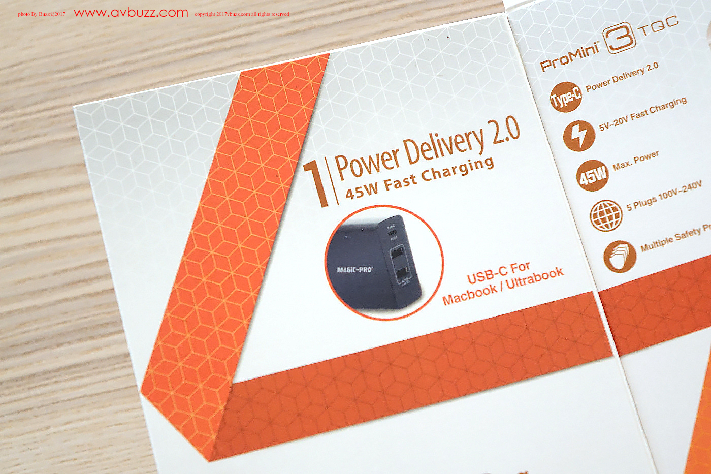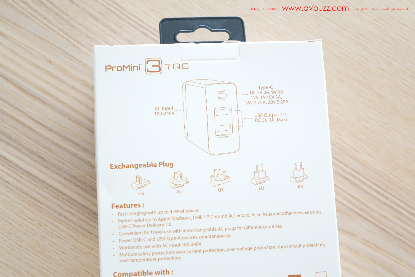 ProMini 3TQC設有3個USB充電接口,內置45W變壓器,可同時為3部裝置充電。ProMini 3TQC擁有 1 組可支援 USB Power Delivery 2.0 的接口(並支援 Qualcomm® Quick Charge 2.0 規格)及1組兩個5V / 3A共享的充電接口,配合套裝中的 Type-C to Type-C充電線,更可支援 USB-PD 充電制式的電子器材充電,例如蘋果的 MacBook 及 任天堂 Switch 等等。
