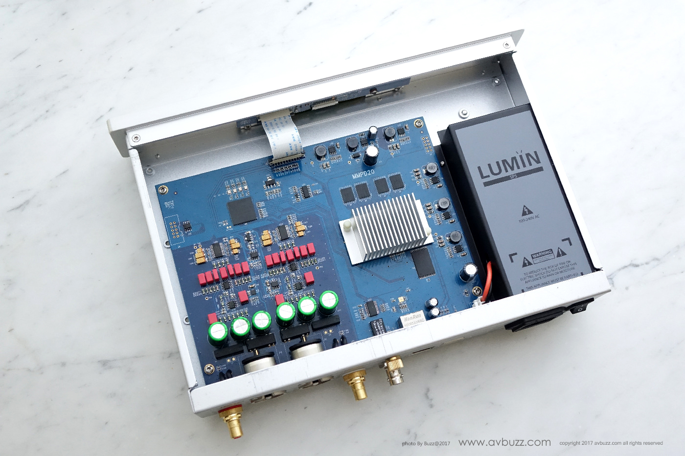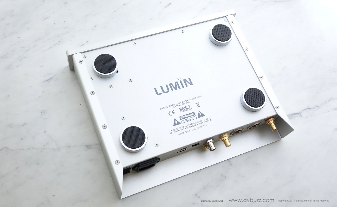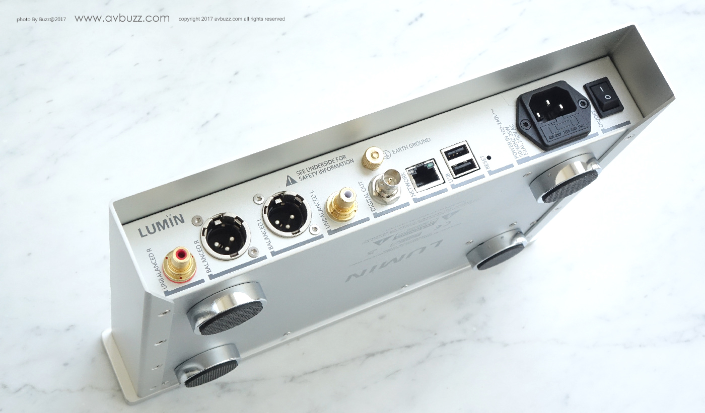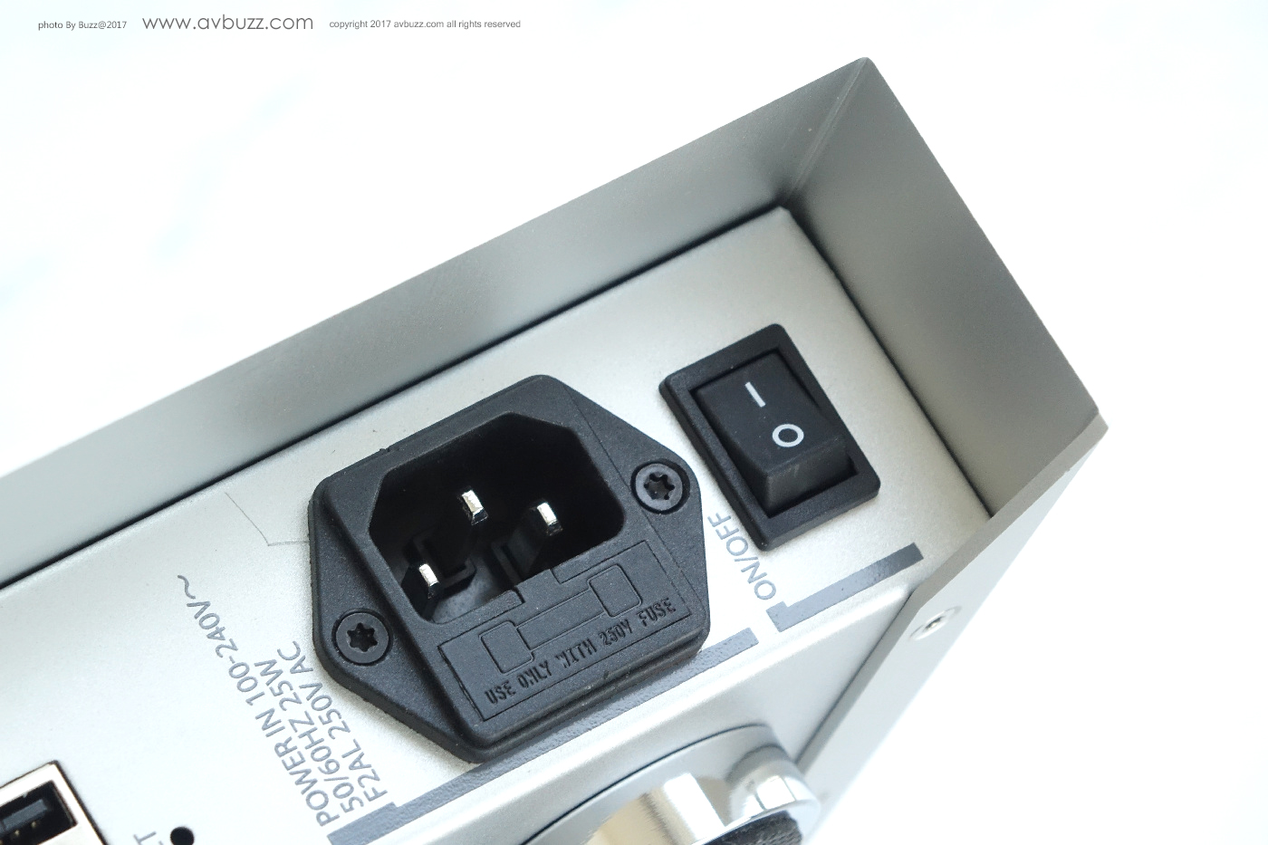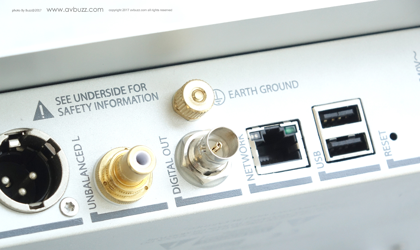正面看完,看大家關心的背面,由最左手邊的兩組模擬音頻輸出,與前作是一樣,來到位於中間的唯一數碼輸出,同樣是 100% 遺存的 BNC 接頭,接下來的LAN 線接位,與兩組方便用家接上外置硬盤的USB接頭口,都是與前作一樣,沒有加多也沒有減少。所以左手邊可以說是沒有變過,但看到最右手邊的電源位置,可就變化得大,附上電源開關鍵的 IEC 接口。