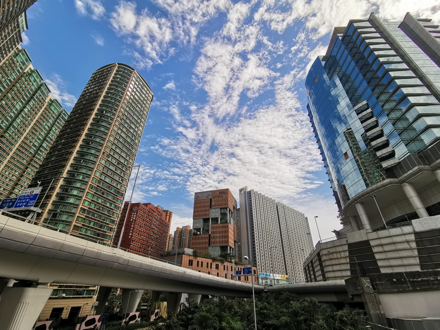 正如上述提到,mate 20 pro 在 AI攝影大師 下,就是一部修圖相機,下圖所見是來自 mate 20 pro 的 print screen 而不是成像圖,所以可見到整個操作介面,也可見到拍攝前,屏幕所見實時影像,留意到 AI攝影大師 認到這是一個藍天,所以她會針對這點而作出處理,留意這是未按鍵拍攝,透過圖中所見,橋底下是比較暗,而右手邊玻璃幕牆,其雲倒影不明顯。