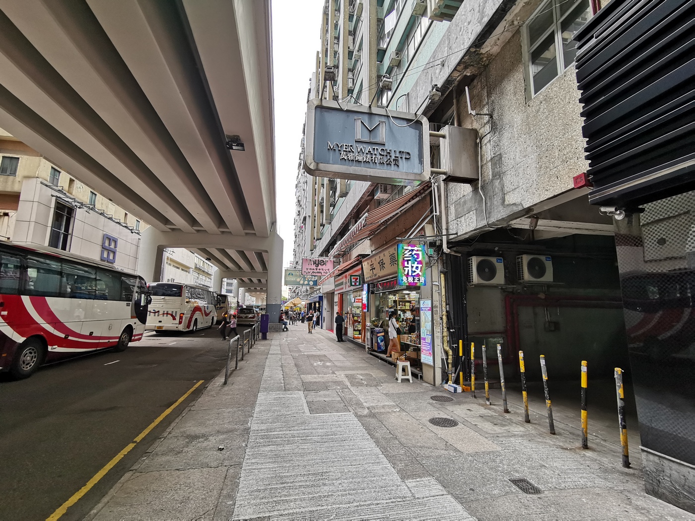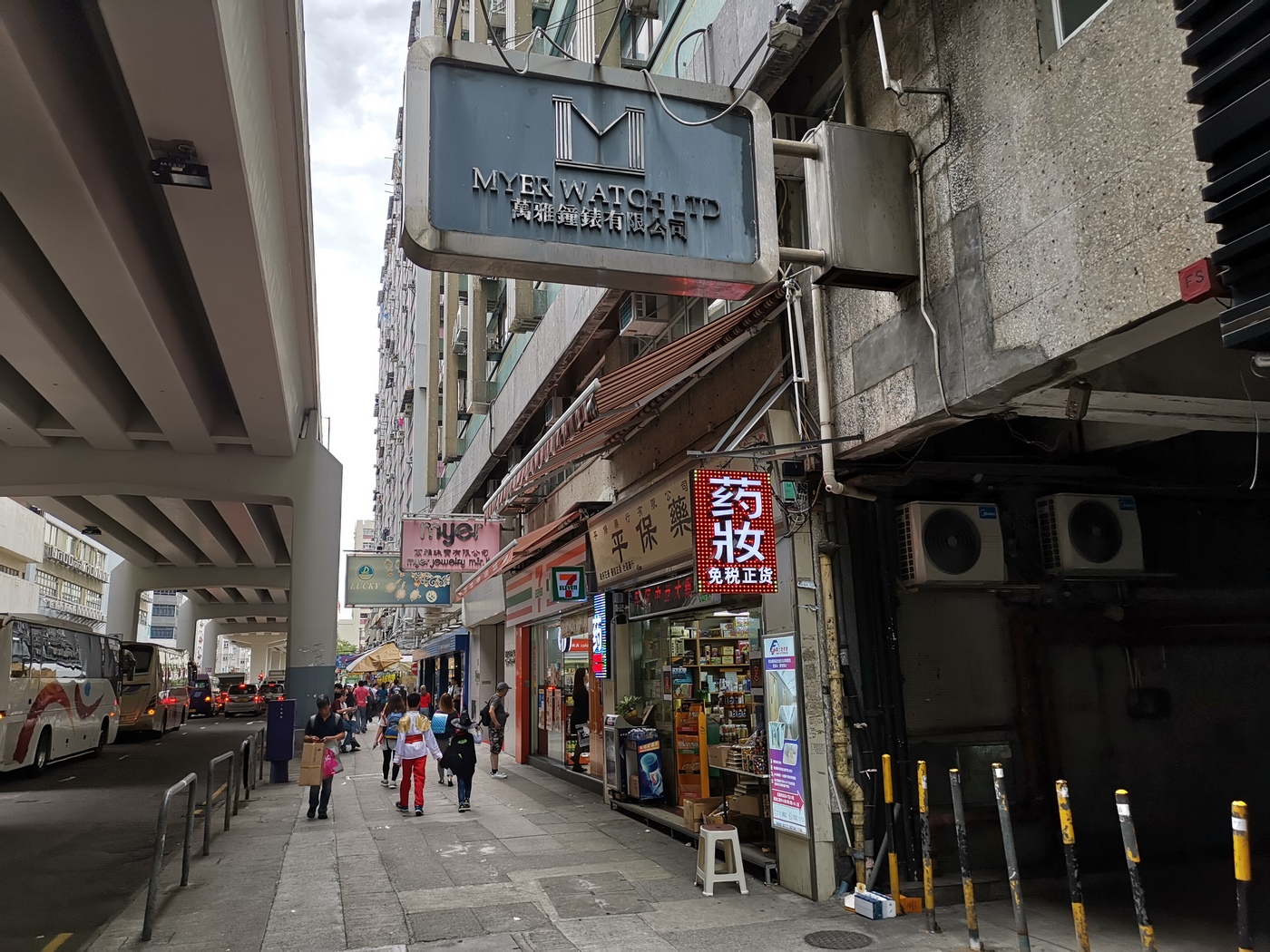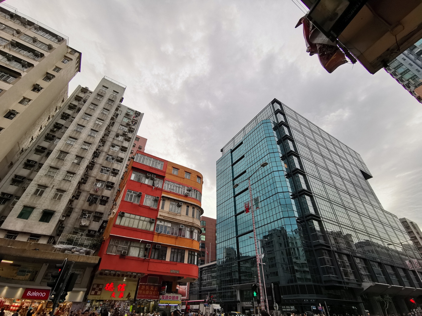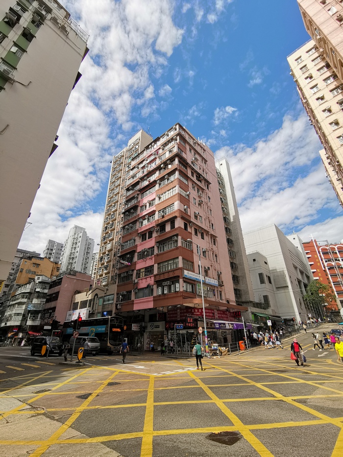 16mm ( 107度 ) 超廣角成像後,變成下圖所見樣子,原來兩部冷氣是藍色底白色字美的冷氣,而冷氣機下面原來有紅色消防喉存在,剛才提到右下角的轉角處,原來是有倒影的玻璃,正反映對面馬路旅遊巴車尾花紋。上述提到,圖中左手邊比較暗的車路慢線位置,現在光亮得多,連旅遊巴的軨都看得一清二楚,最重要是上述暗位一一被推光後,不會影響到遠處樓宇的光位過曝。效果當然無修圖高手咁靚啦,喜歡的話,因為 mate 20 pro 仲可以支援影 RAW ,返屋企慢慢玩都得,但對我呢類食物鏈底層的人來講,按個掣就有呢個效果,仲可以大大聲講直出,你話唔開心死呀。