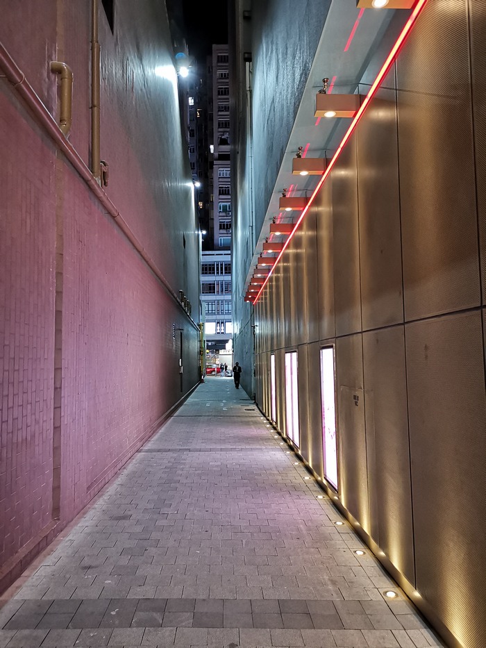 但話得說回來,同樣使用所謂超廣角鏡,雖然 mate 20 pro 廣角效果不夠 LG V20 來得闊,但勝在變形極小,下圖所見是企近橫線牆身以 mate 20 pro 16mm ( 107度 ) 超廣角鏡拍攝,成像出來,左右兩邊一點變形也沒有,咁講,無咁闊變形自然小吧,廢話中的廢話!